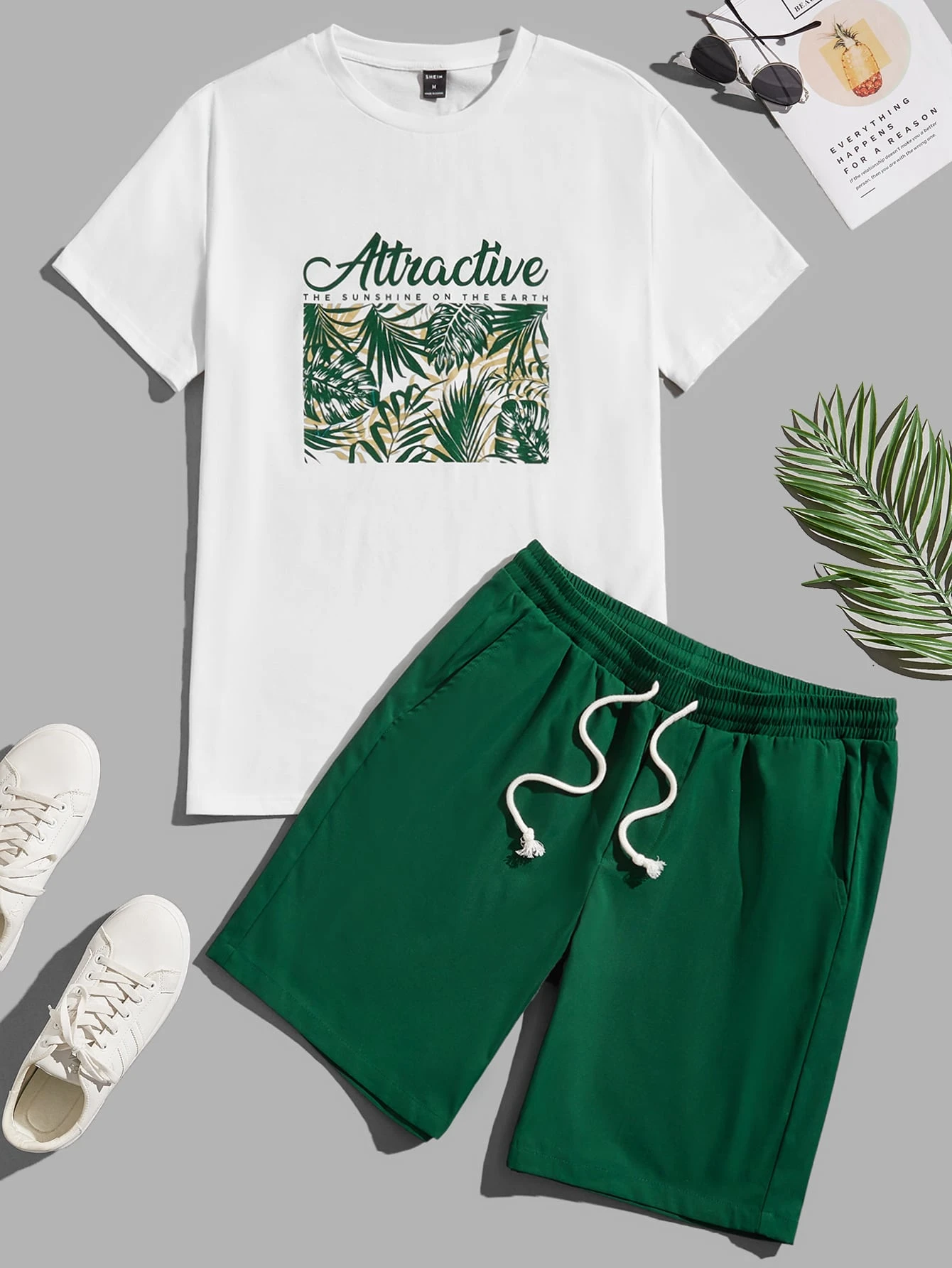 GENTILAND Uomo Maglietta con stampa lettera e tropicale & Shorts con coulisse a vita