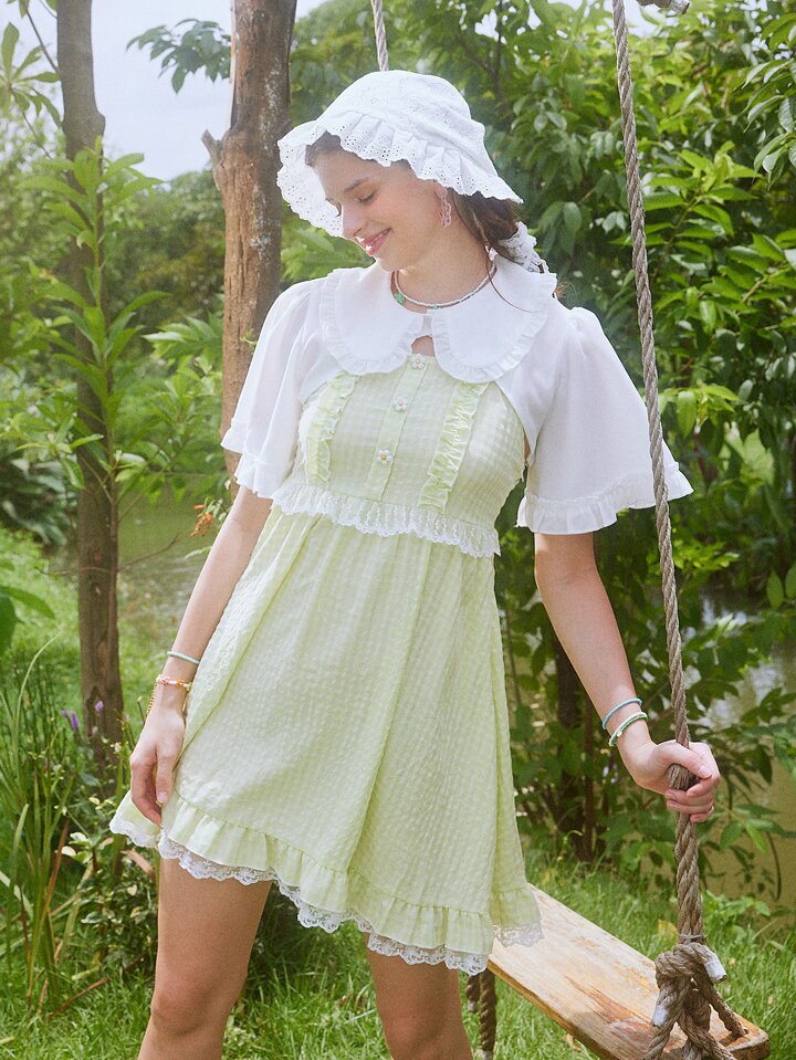 Abito con bretelle sottile a quadri pizzo a contrasto con volant