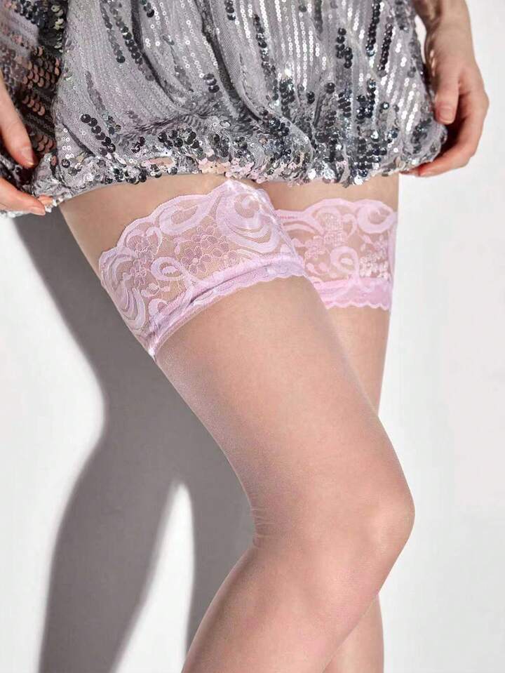 1 Paio di calze coprenti alla coscia stile ballerina con bordo in pizzo rosa, collant trasparenti sexy con patchwork in pizzo elastico
