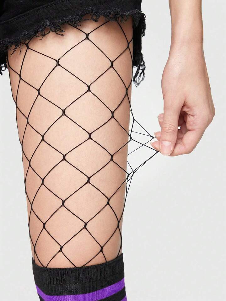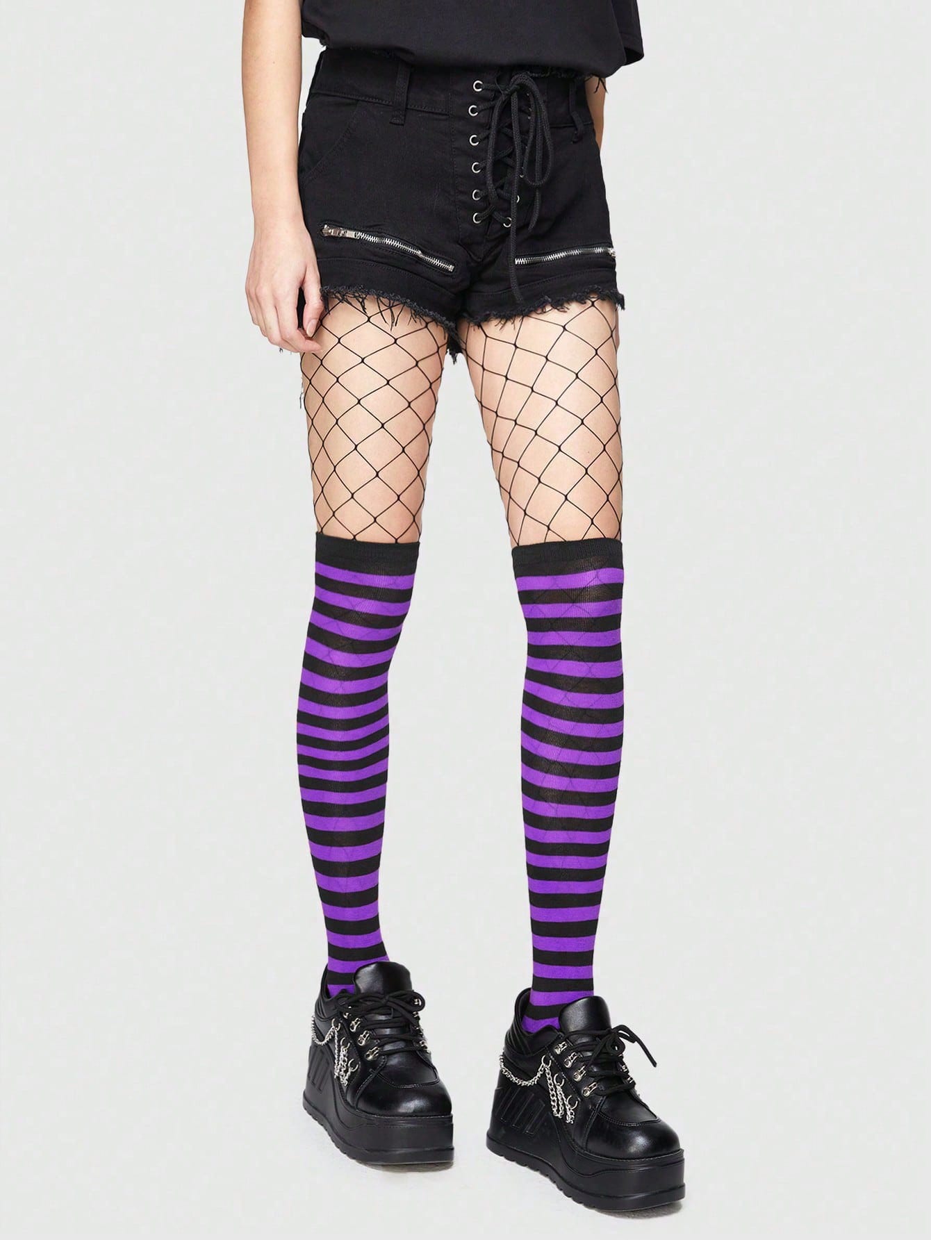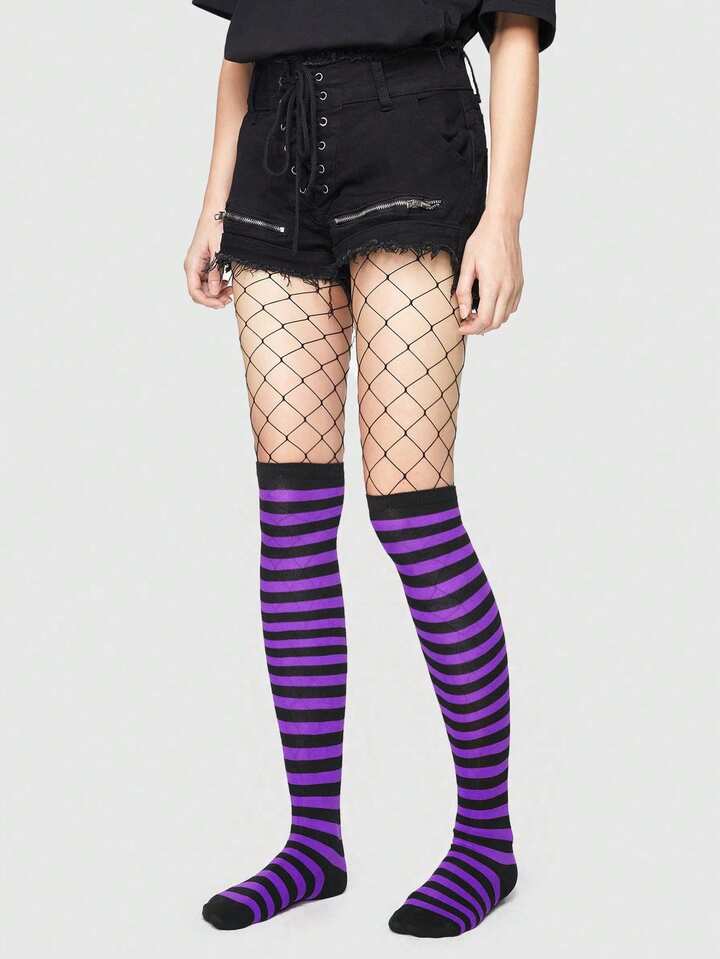 Goth 1 paio di mutande minimaliste in rete + 1 paio di calze al ginocchio a righe in contrasto nero e viola, combinazione stile punk, adatte per l'autunno