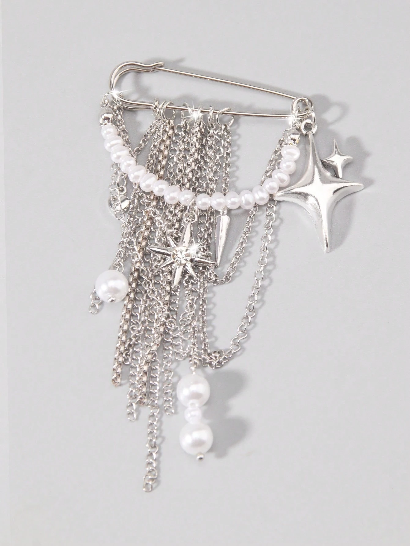 Goth 1 pezzo Spilla di moda con imitazione di perle, stile di lusso, decorata con stelle e strass, con catena e nappe, grande fibbia di per borsa, cintura o accessori