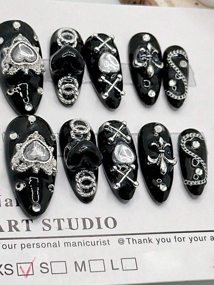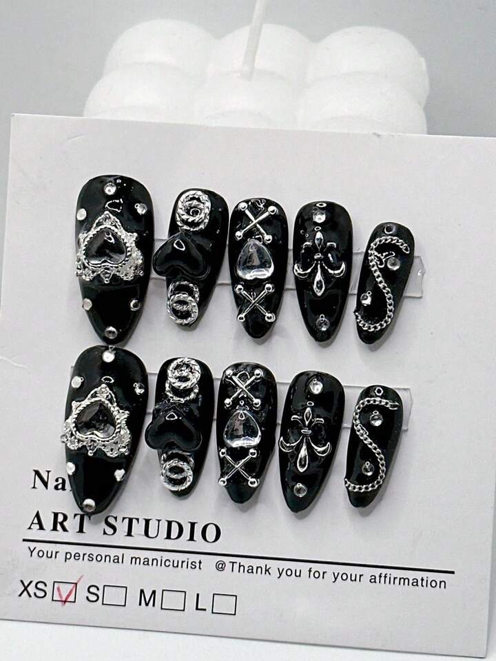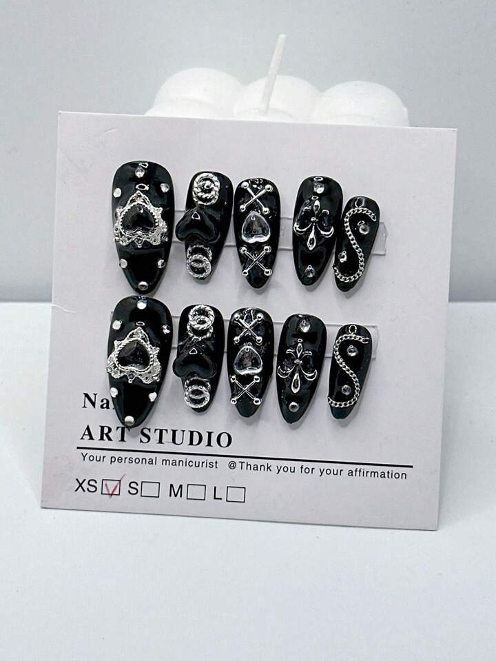 Goth 10 pezzi lungo mandorla con strass Unghie finte & 1 foglio nastro