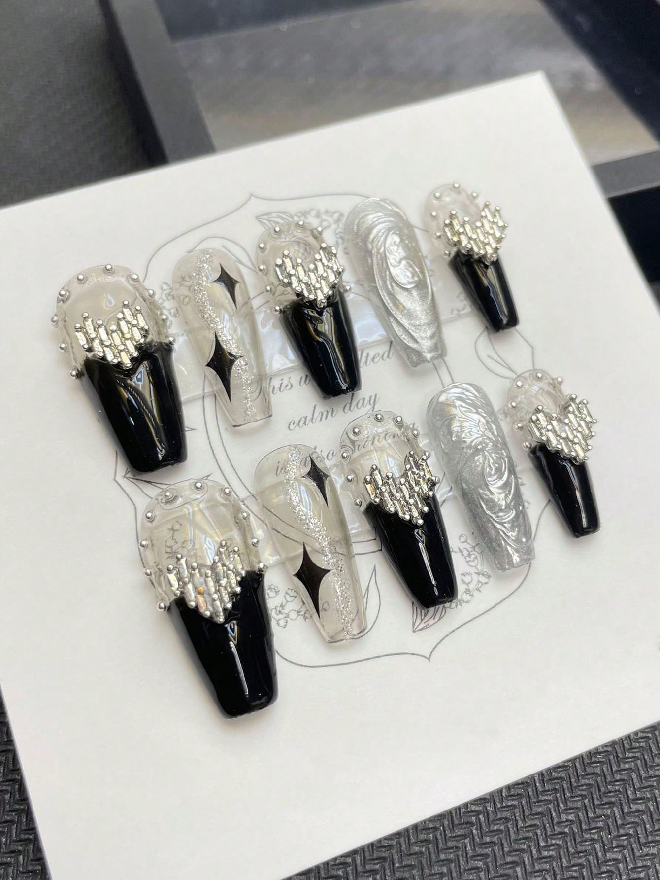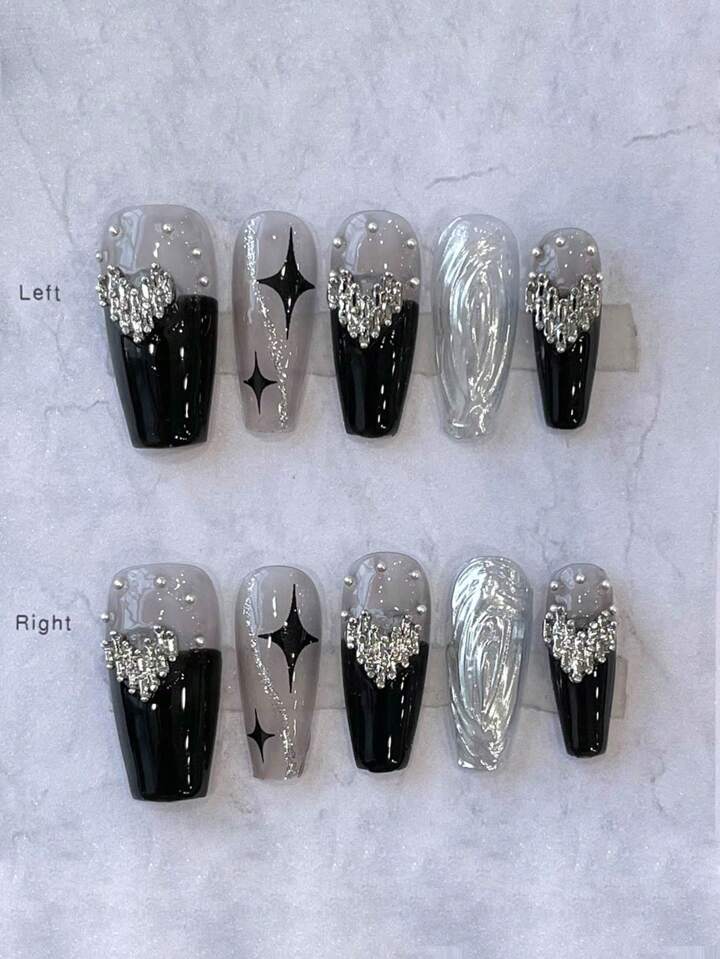 Goth 10 pezzi/pacco Unghie finte stile Hepburn per unghie lunghe con colla gelatinosa gratuita