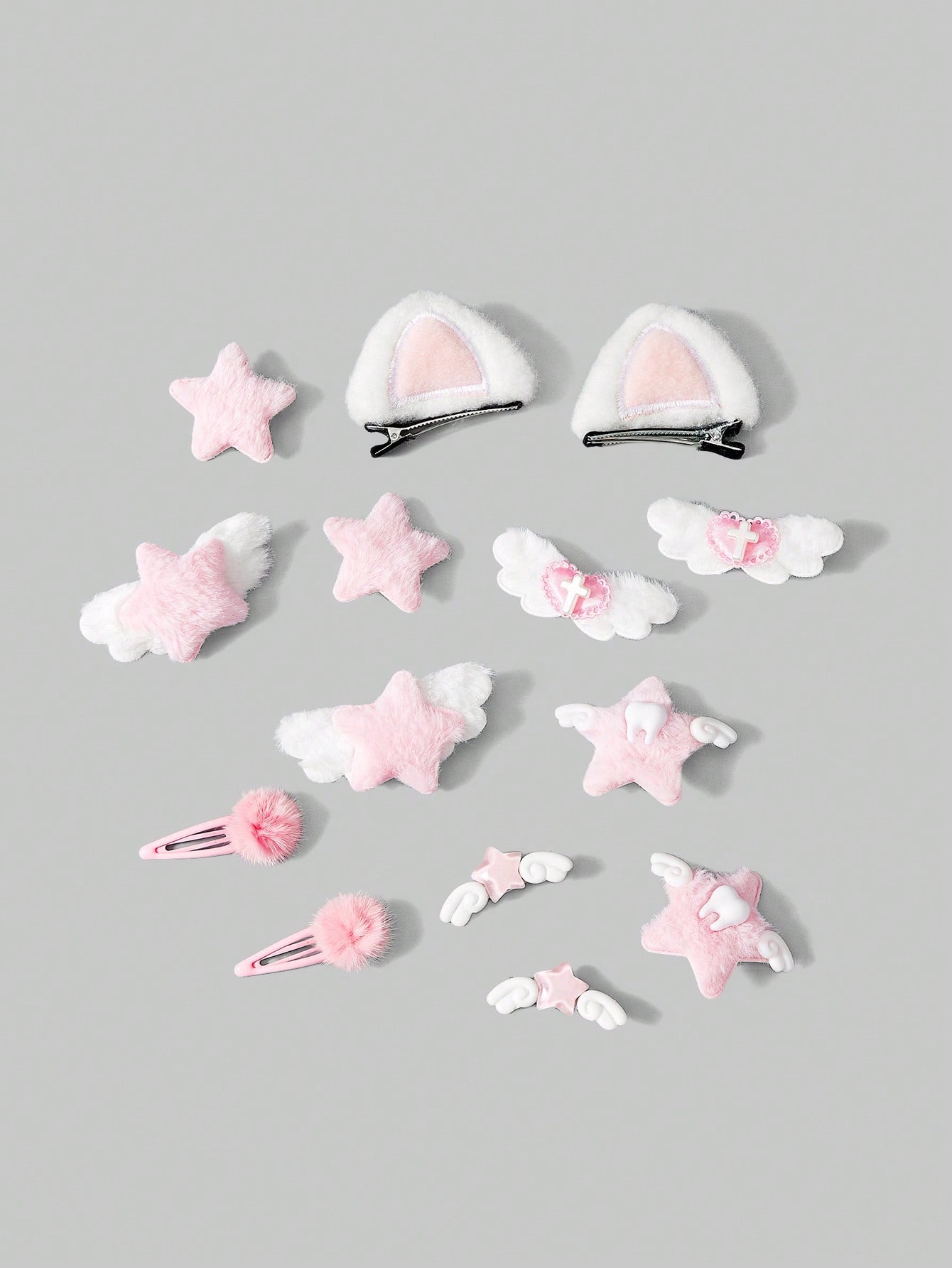 Goth 14 stili casuali di forcine fatte a mano, con fiori rosa, stelle a forma di pallina, orecchie di gatto, ali d'amore, combinazione di elementi a forma di stella, vento carino, forcine per capelli soffici e spettinati, combinazione di accessori per capelli.