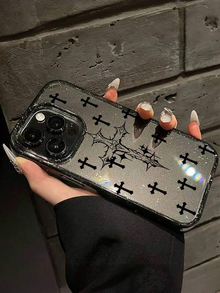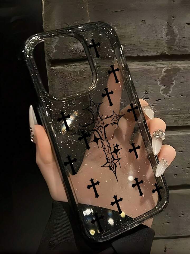 Goth 1 pezzo Custodia trasparente per telefono con glitter e motivo 8 ball, di stile streetwear