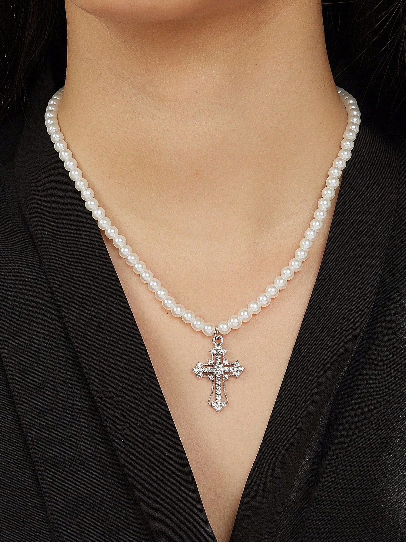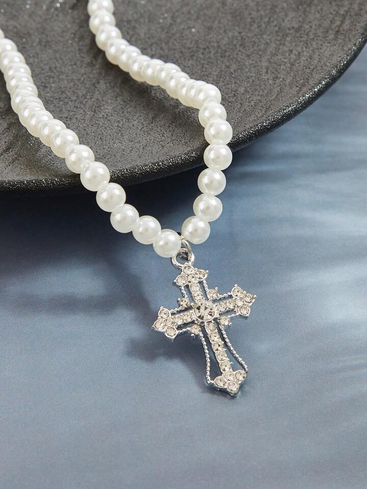 Goth 1 Pezzo Collana Ciondolo Vintage Con Incastonatura Di Perle E Decorazione Di Strass A Croce