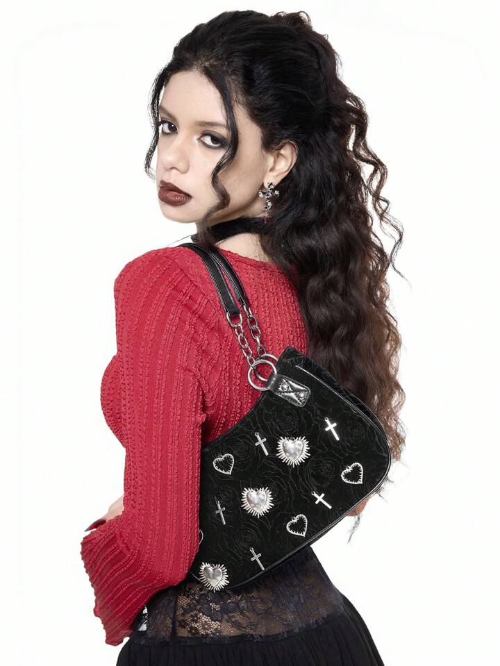 Goth 1 pezzo Borsa a spalla da donna con decorazione in metallo a forma di cuore con rilievo floreale in velluto, adatta per San Valentino e appuntamenti