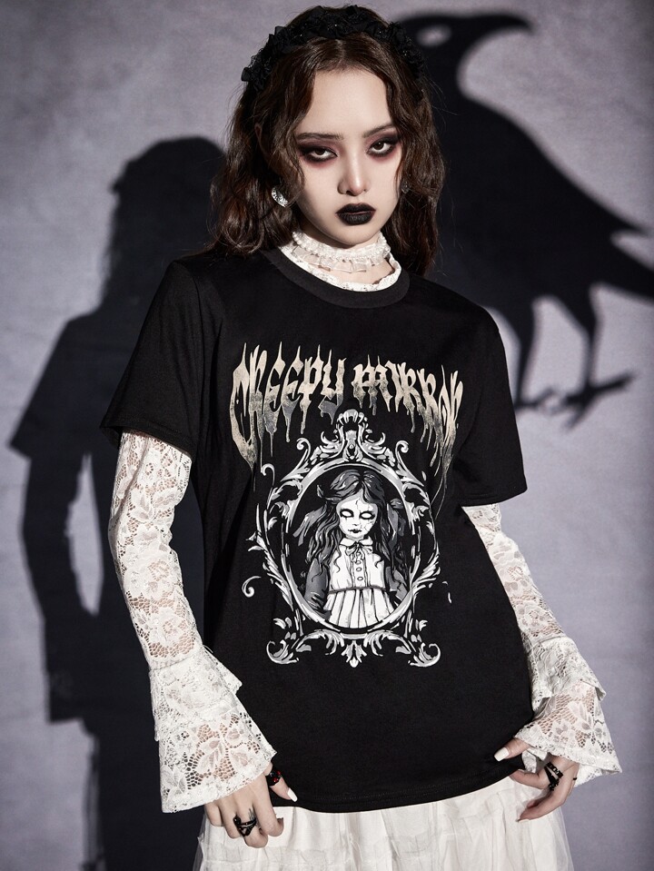 Goth 2 in 1 lettere Bambola grafico pizzo a contrasto Maglietta