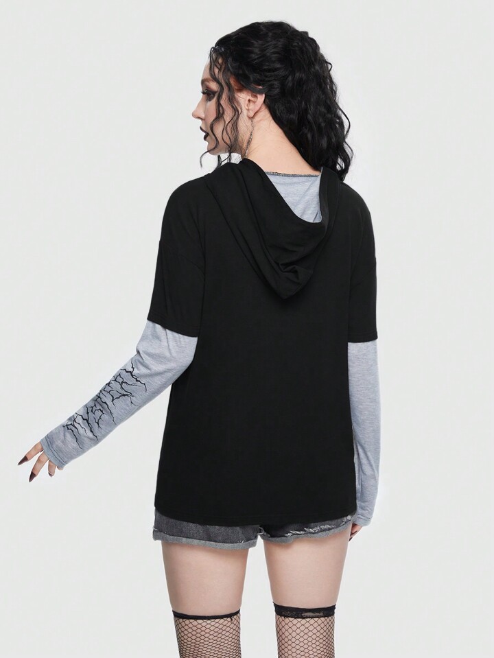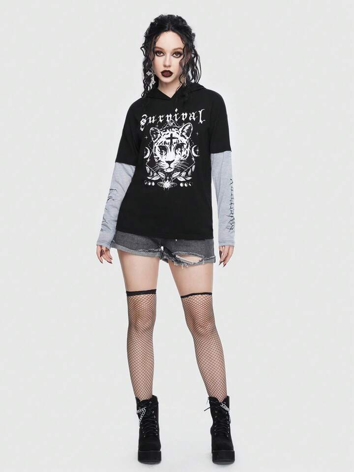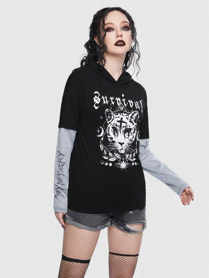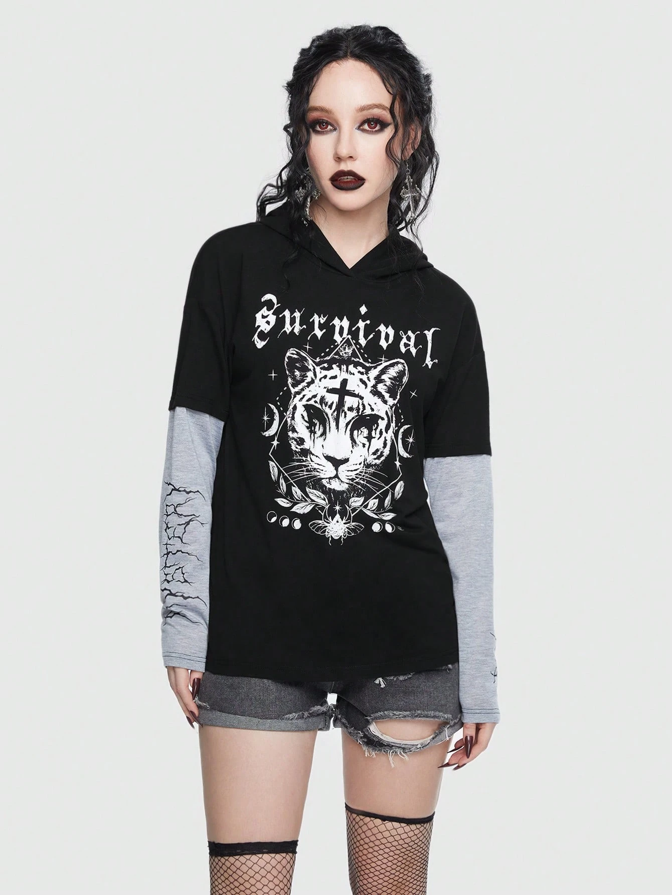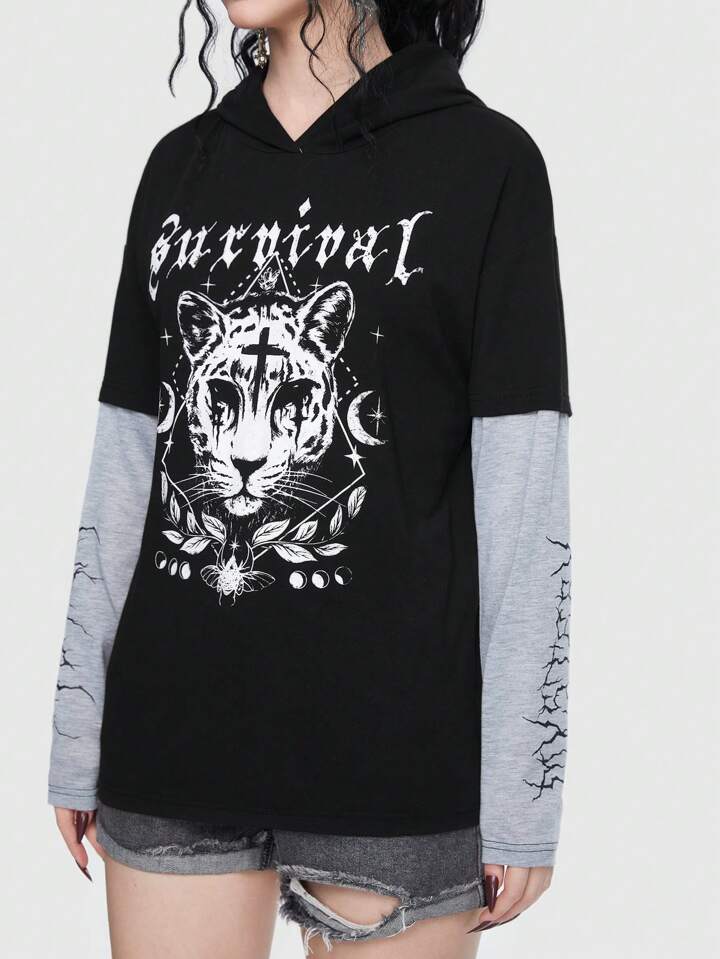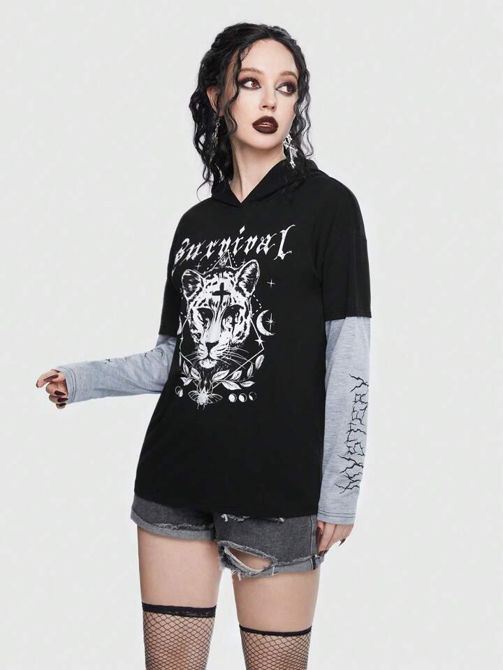 Goth Maglietta 2 in 1 con grafica lettera e tigre con cappuccio