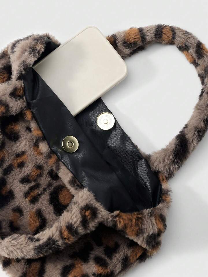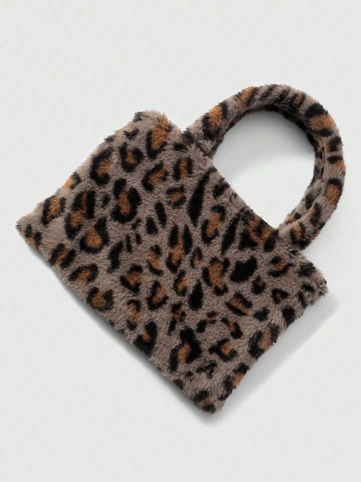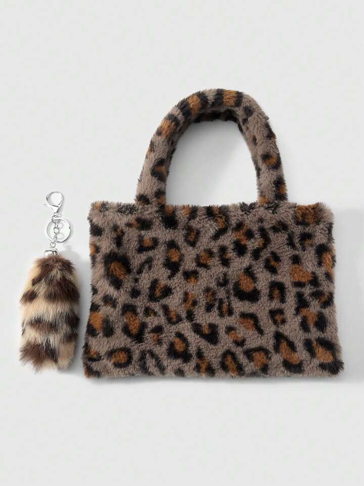 Goth 2 pezzi Set combo: Borsa casual e versatile della serie Maillard, con stampa animalier leopardo e tigre in pelliccia di coniglio sintetica, adatta per l'uso quotidiano e come regalo, + Portachiavi a forma di coda di leopardo in pelliccia sintetica marrone, adatto per le donne, per uso quotidiano e come regalo
