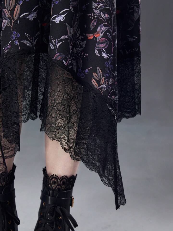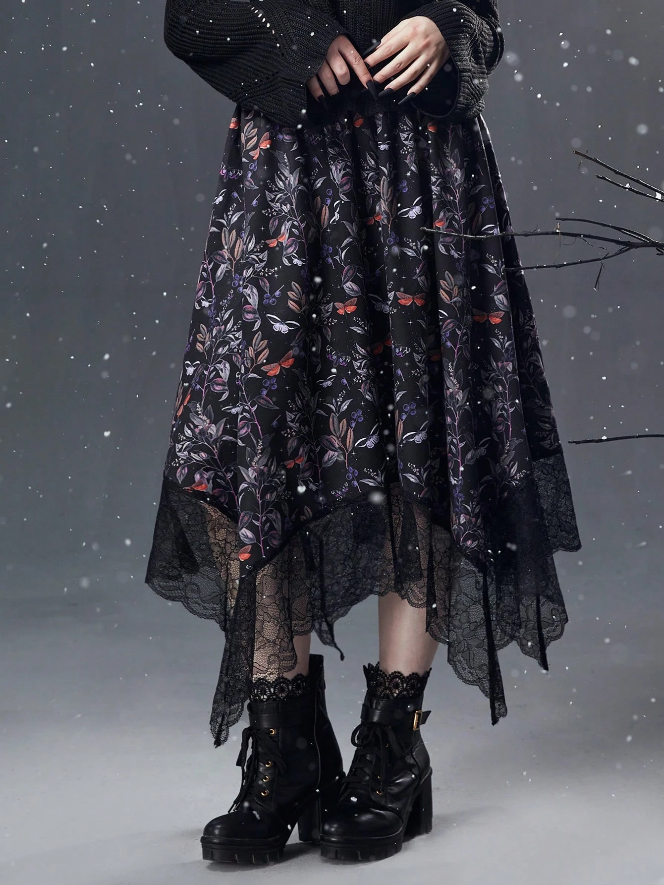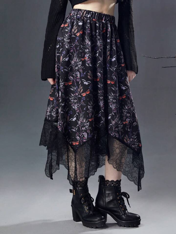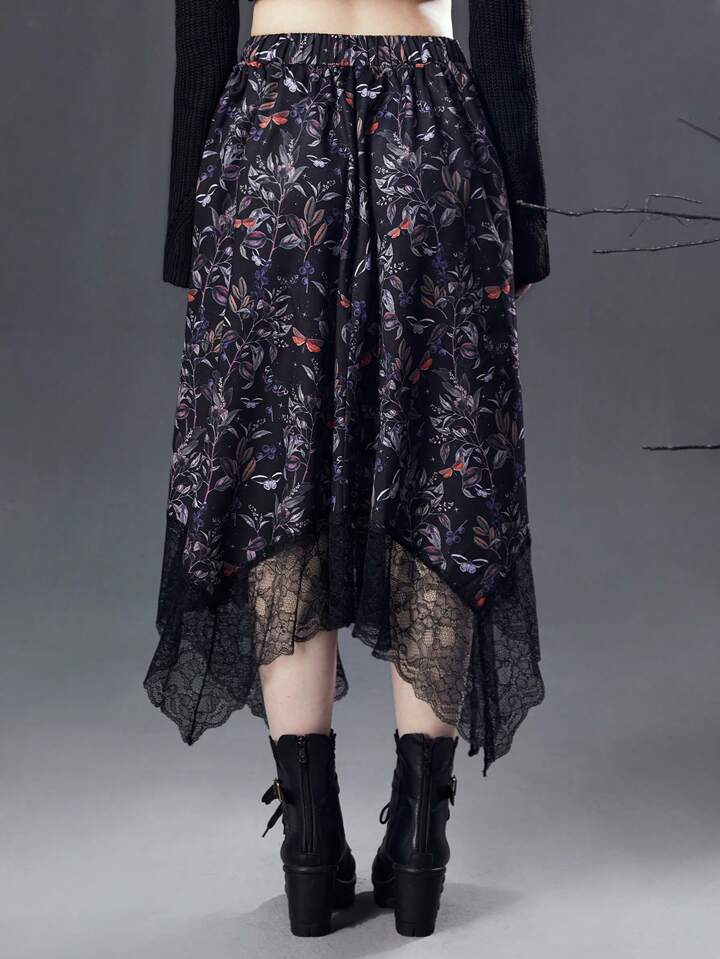 Goth Gonne con stampa piante all over pizzo a contrasto orlo asimmetrico
