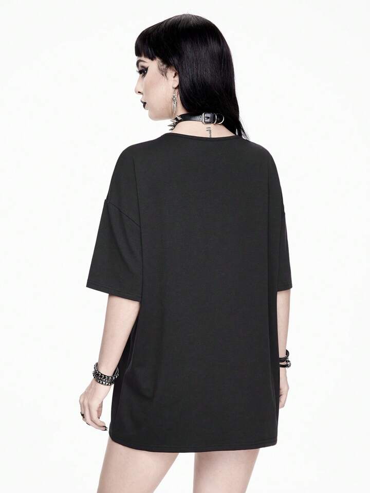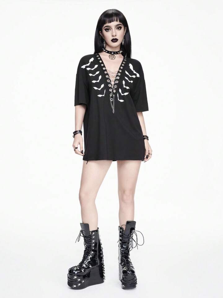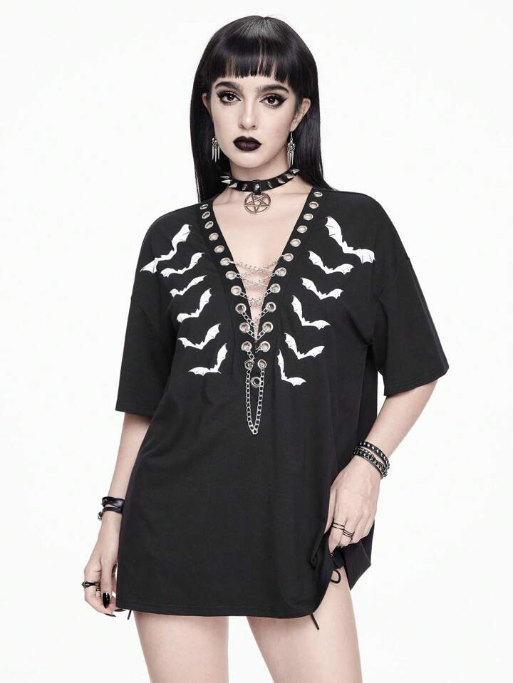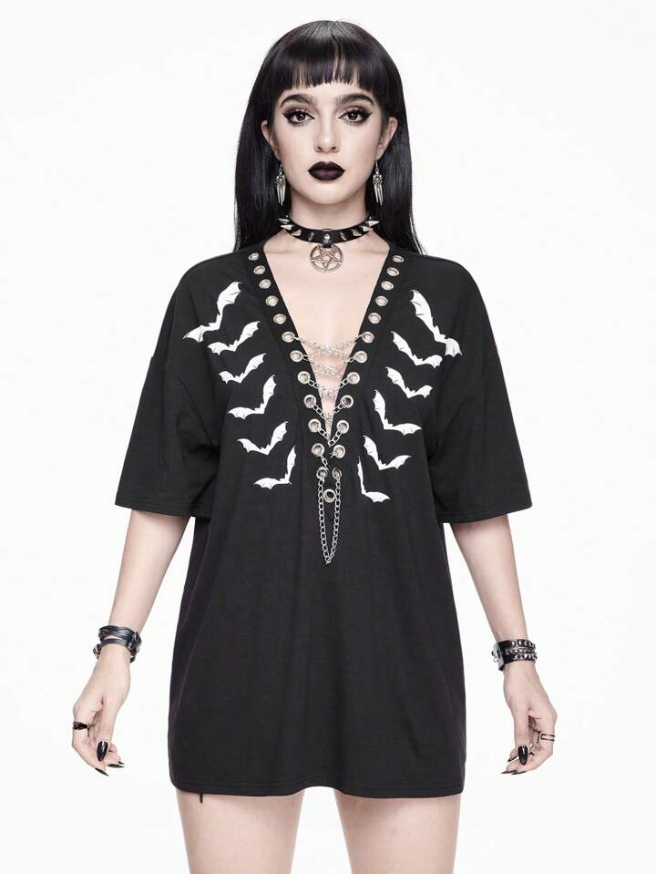 Goth maglietta larga da donna con scollo a V profondo, stampa a pipistrello e catena con occhielli