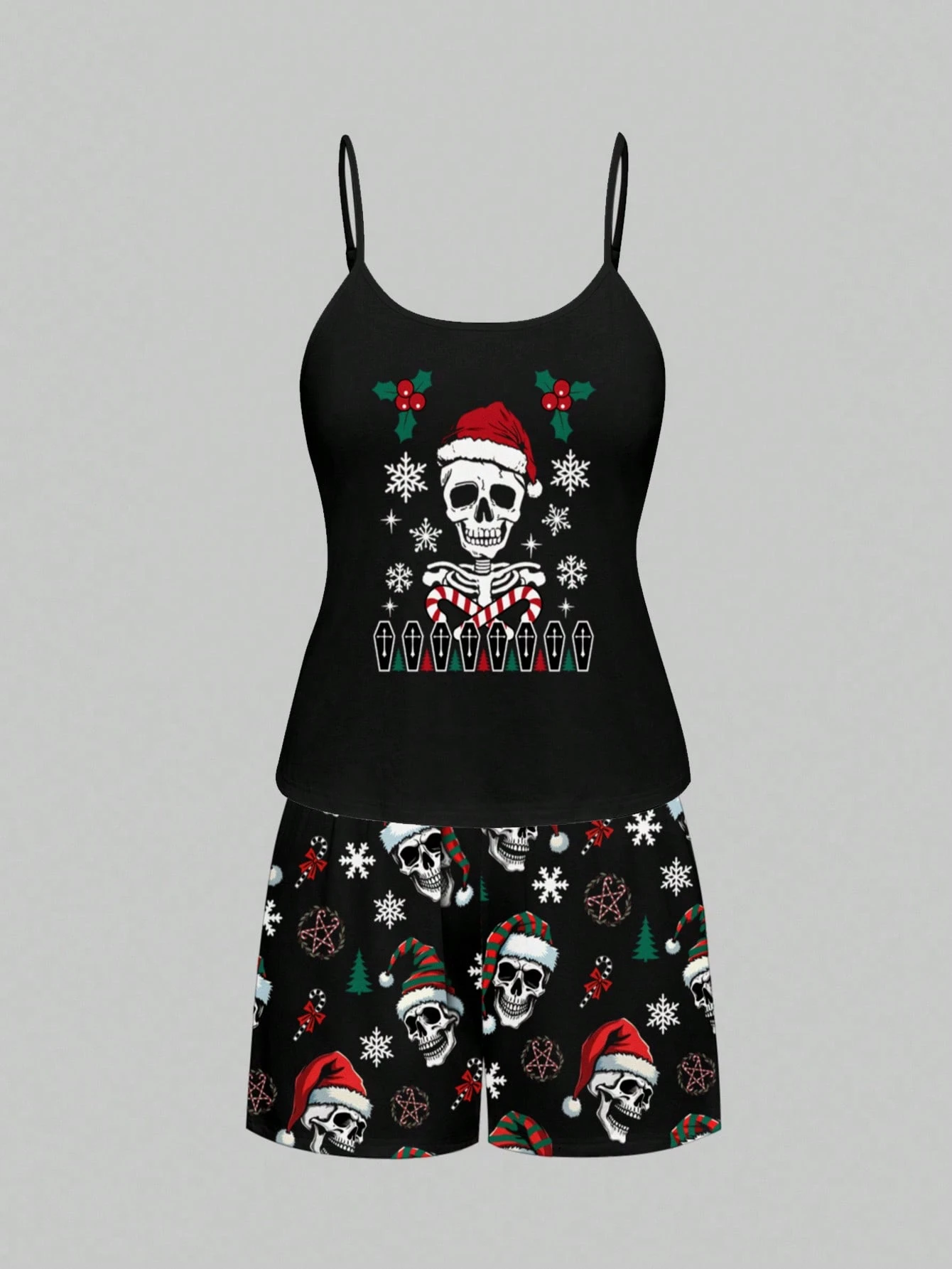 Goth Set pigiama con canottiera e pantaloncini con stampa integrale di albero di Natale, teschio, bastoncino di zucchero a forma di fiocco di neve, cappello da Babbo Natale a forma di teschio, fiocco di neve, adatto a taglie forti, abbigliamento casual da notte