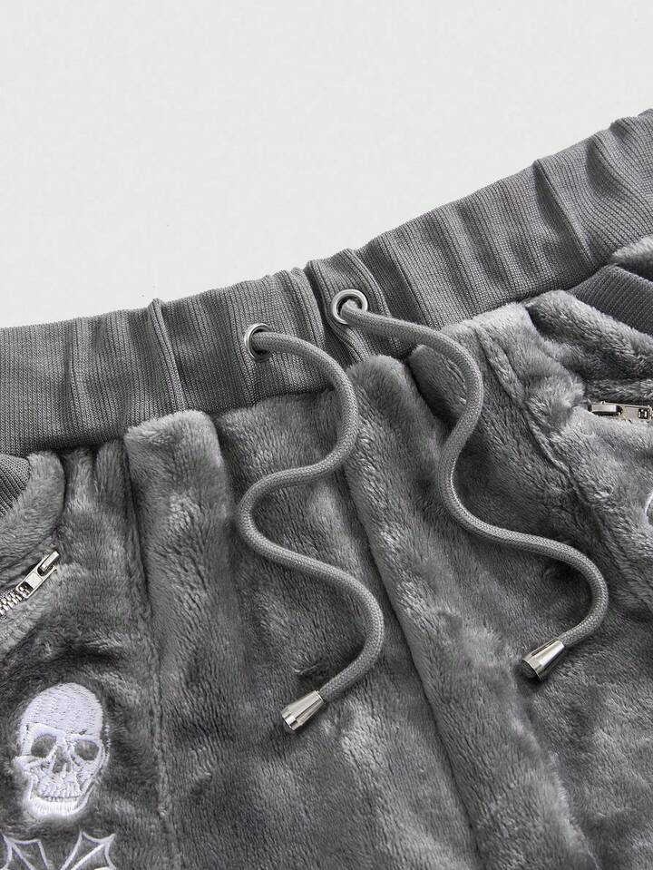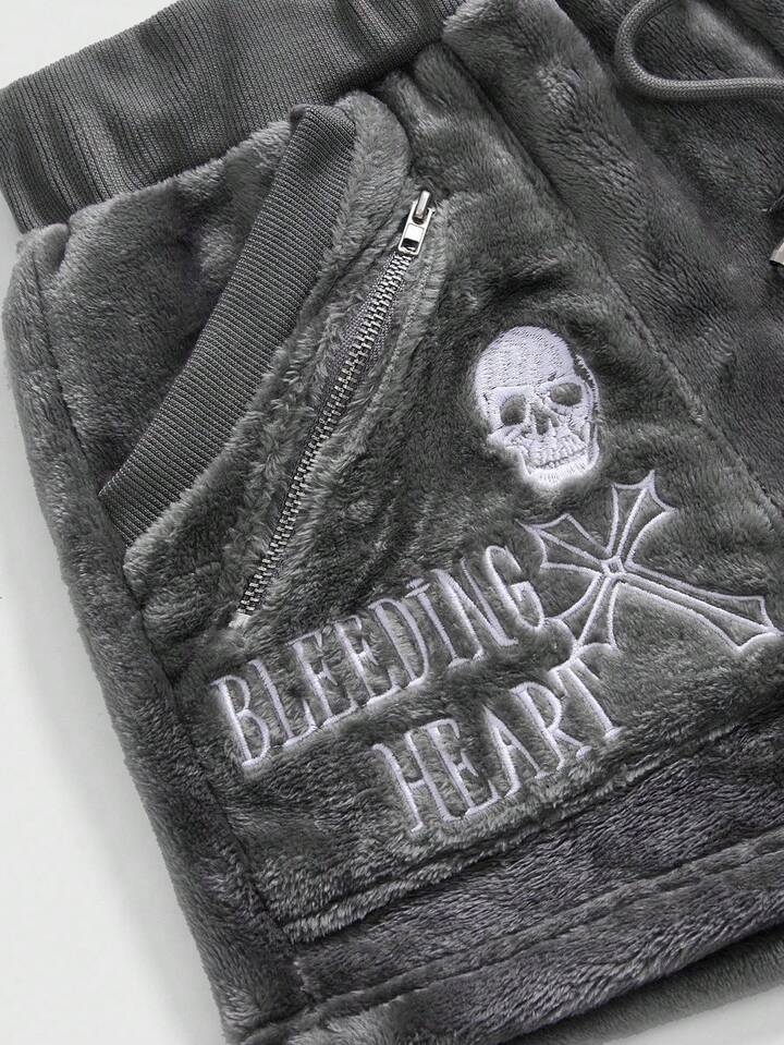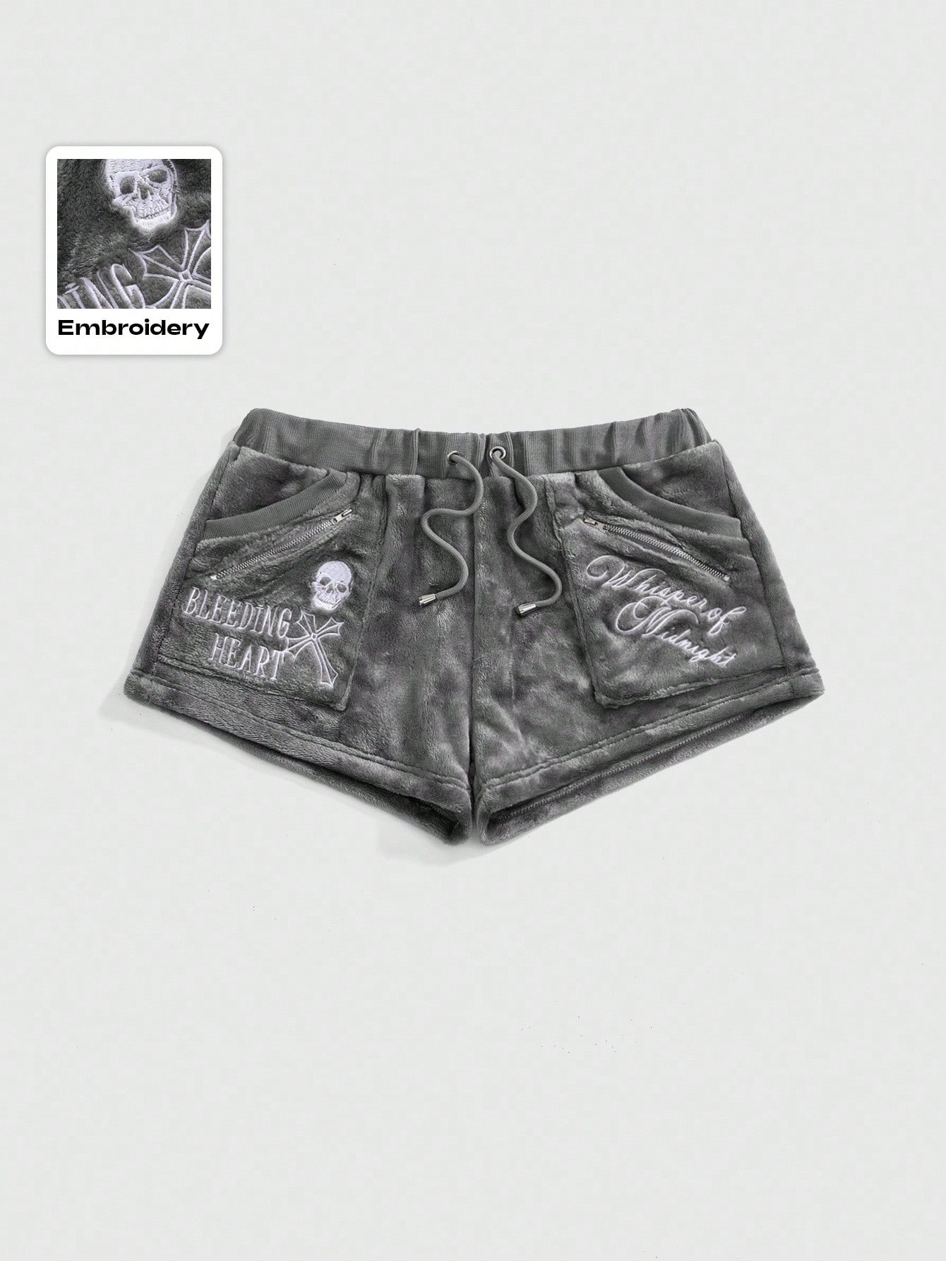 Goth Shorts in stile universitario con ricamo di lettere e teschio, con chiusura lampo, in tessuto morbido, adatti per Ognissanti
