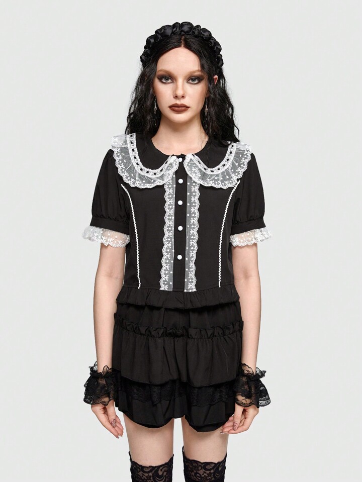 Goth Camicia pizzo a contrasto con bottone frontale