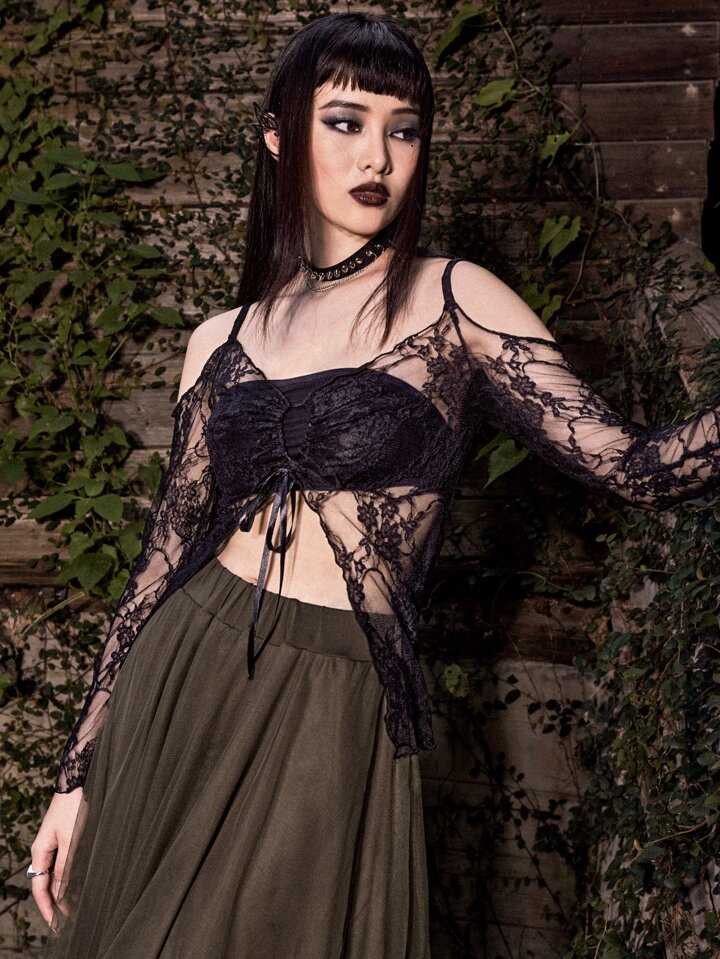 Goth Top pizzo a contrasto con spalle scoperte trasparente