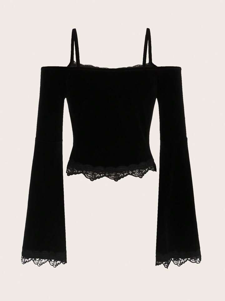 Goth Maglietta pizzo a contrasto con spalle scoperte di velluto