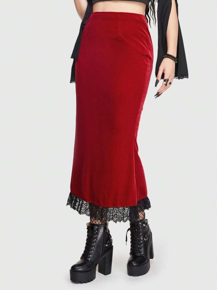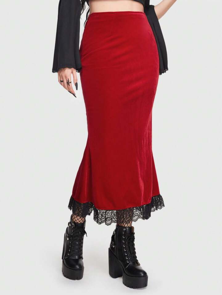 Goth Gonne pizzo a contrasto con orlo a sirena di velluto