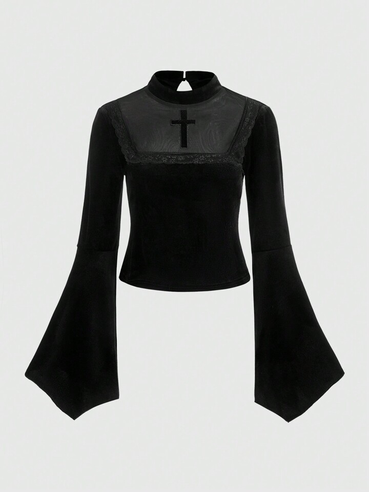 Goth Maglietta pizzo a contrasto collo dritto con manico svasato di velluto