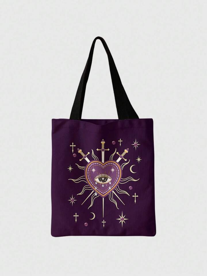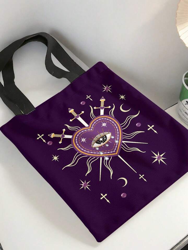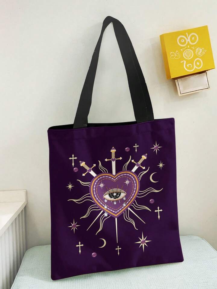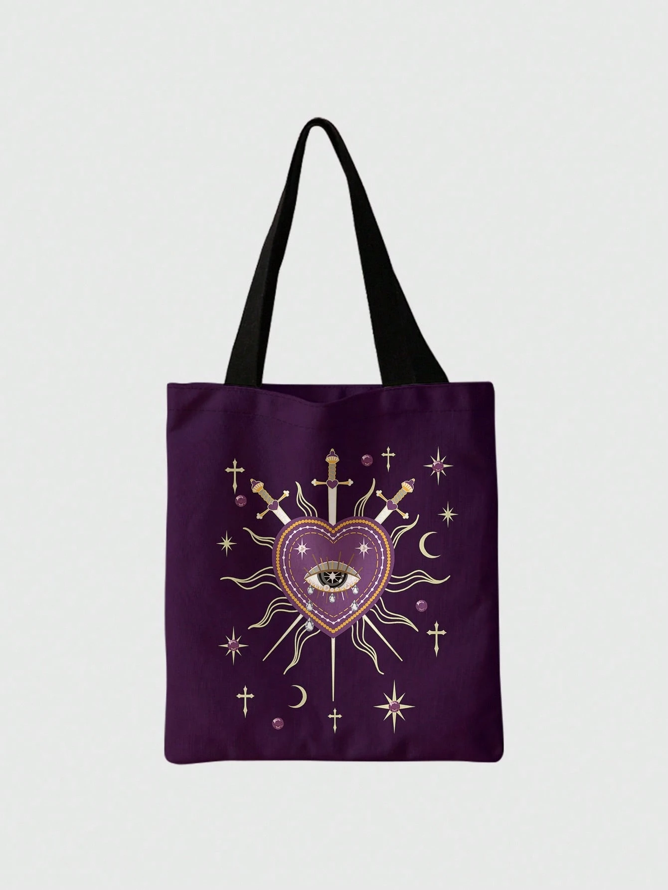 Goth Borsa a tracolla riutilizzabile stile corte con motivi di occhi, spade, cuori, stelle e lune, zaino alla moda, borsa multifunzione, borsa shopper in tela stampata, borsa a spalla con motivi