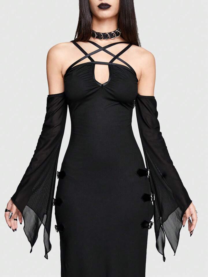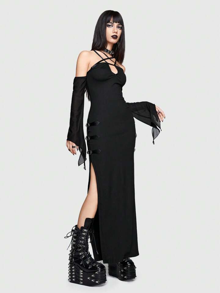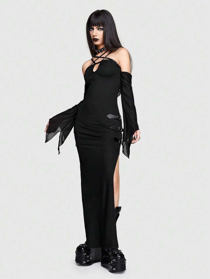 Goth Abiti incrociato frontale a fessura alta con collo halter con manico svasato