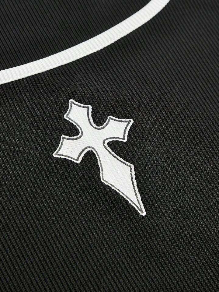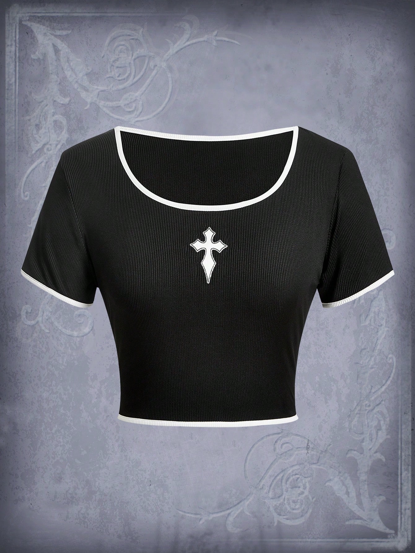 Goth Maglietta corta incrociato stampa a costine bordo a contrasto