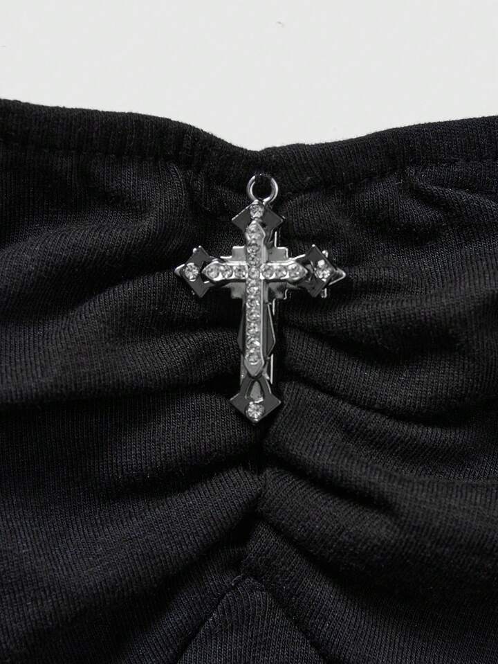 Goth Elegante maglietta per le donne Slim Fit di colore solido con pizzo legato al petto, ruches e fiocco a pendente elastico a maglia