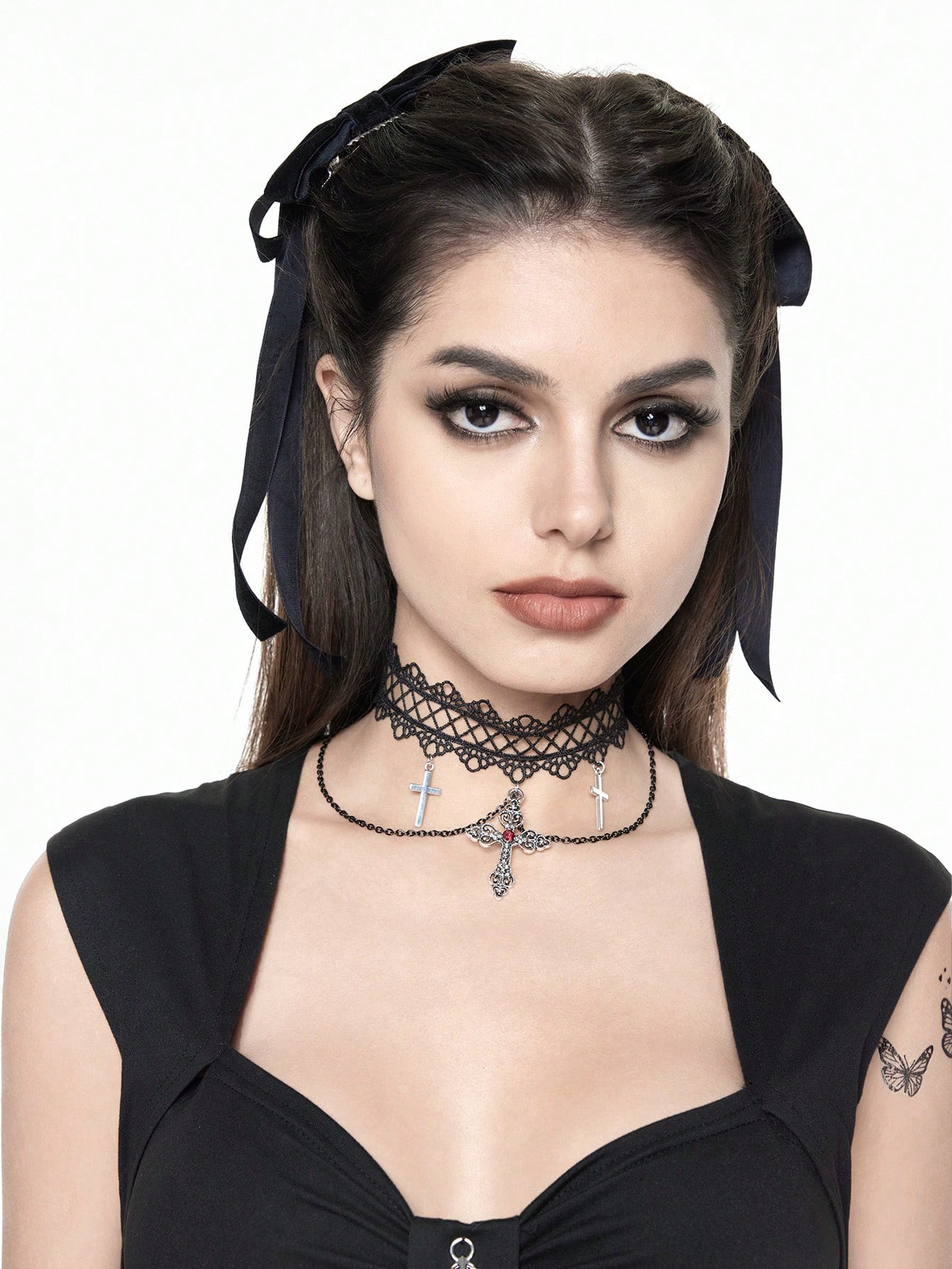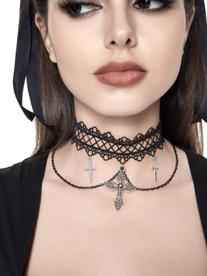Goth Collana girocollo alla moda con pendente a croce di pizzo nero