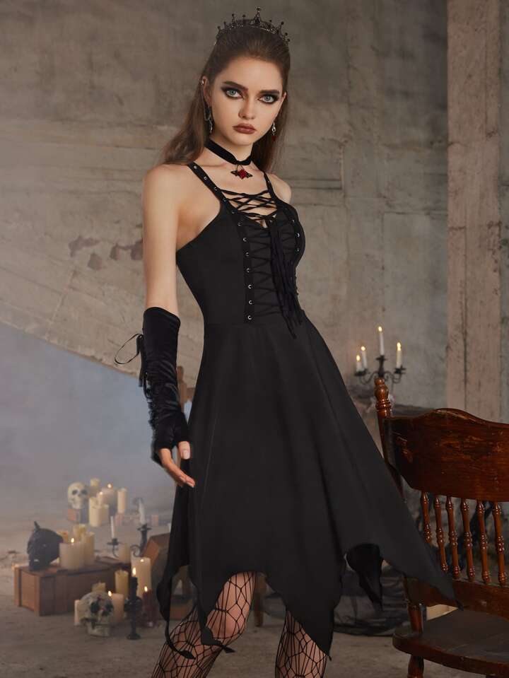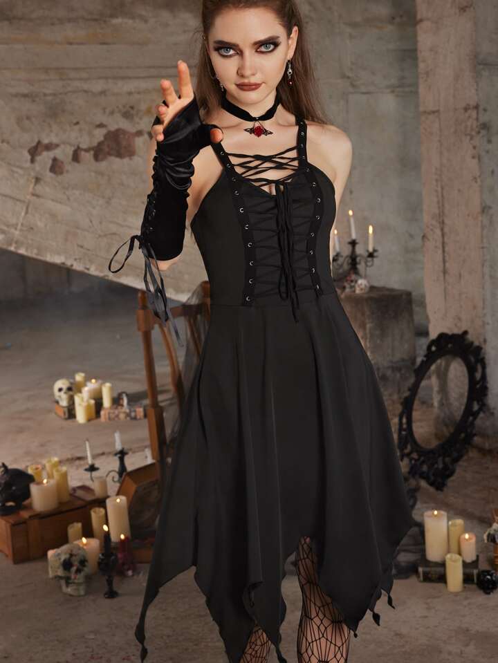 Goth Abito con bretelle sottile gommino con lacci con orlo asimmetrico senza maniche
