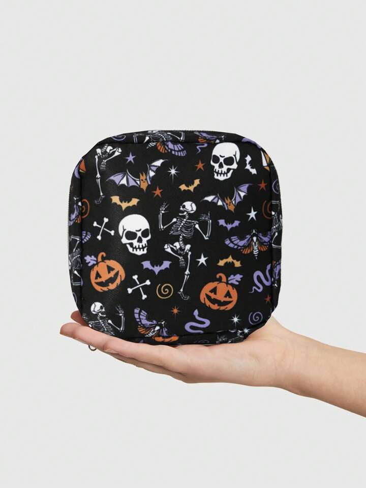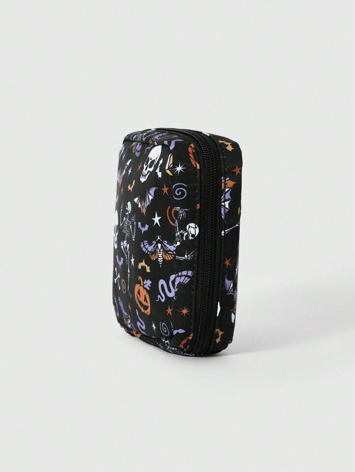 Goth Borsa per cosmetici portatile imbottita di grande capacità con motivi di pipistrelli, teschi e zucche di Ognissanti, piccolo beauty case rettangolare 1048918