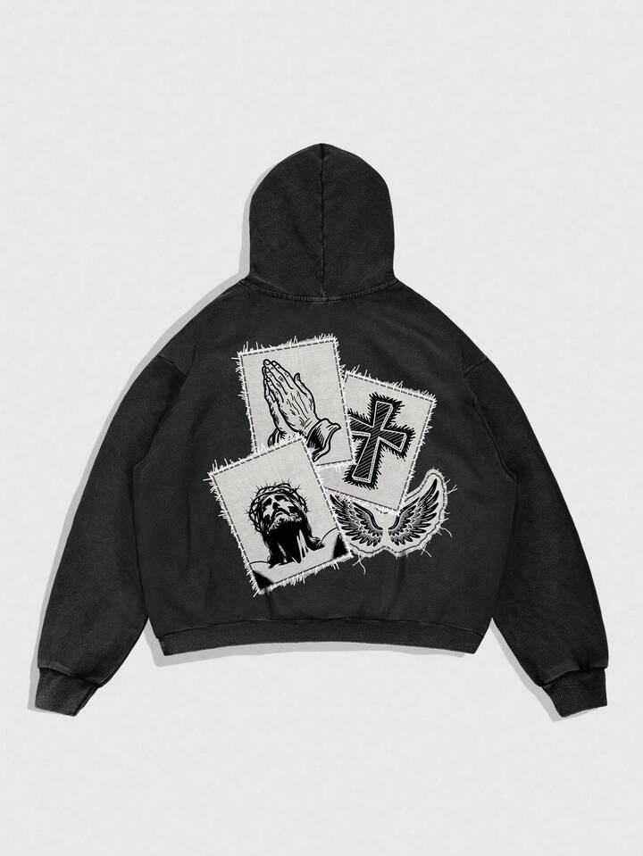 Goth Felpa con cappuccio nera da uomo con stampa casual di slogan e croce, manica lunga, foderata termicamente, per l'autunno