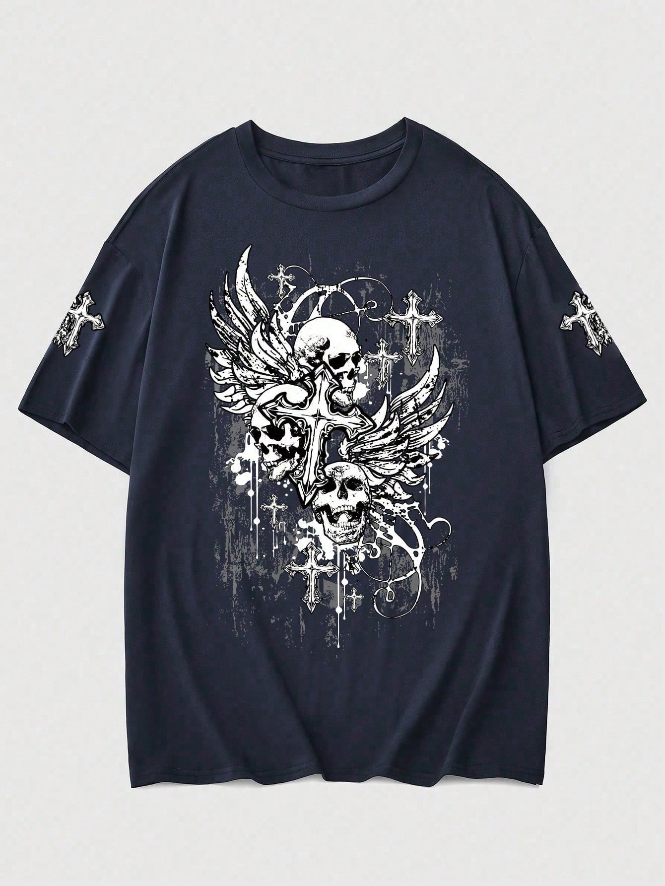Goth T-shirt casual da uomo a maniche corte con stampa di teschio e croce, scollo rotondo, estiva