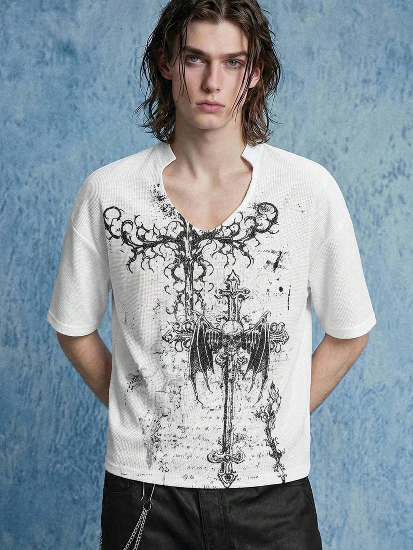 Goth Maglietta bianca da uomo a maniche corte con scollo a V e stampa a croce
