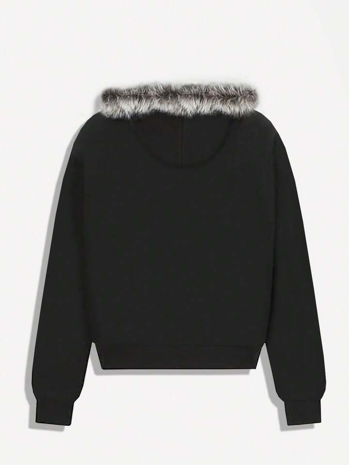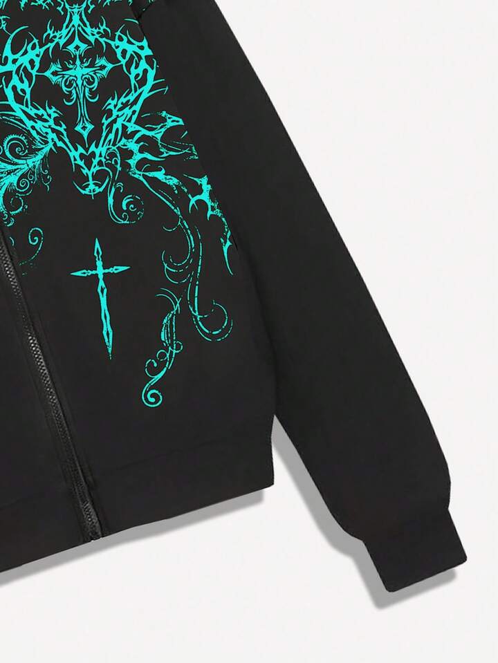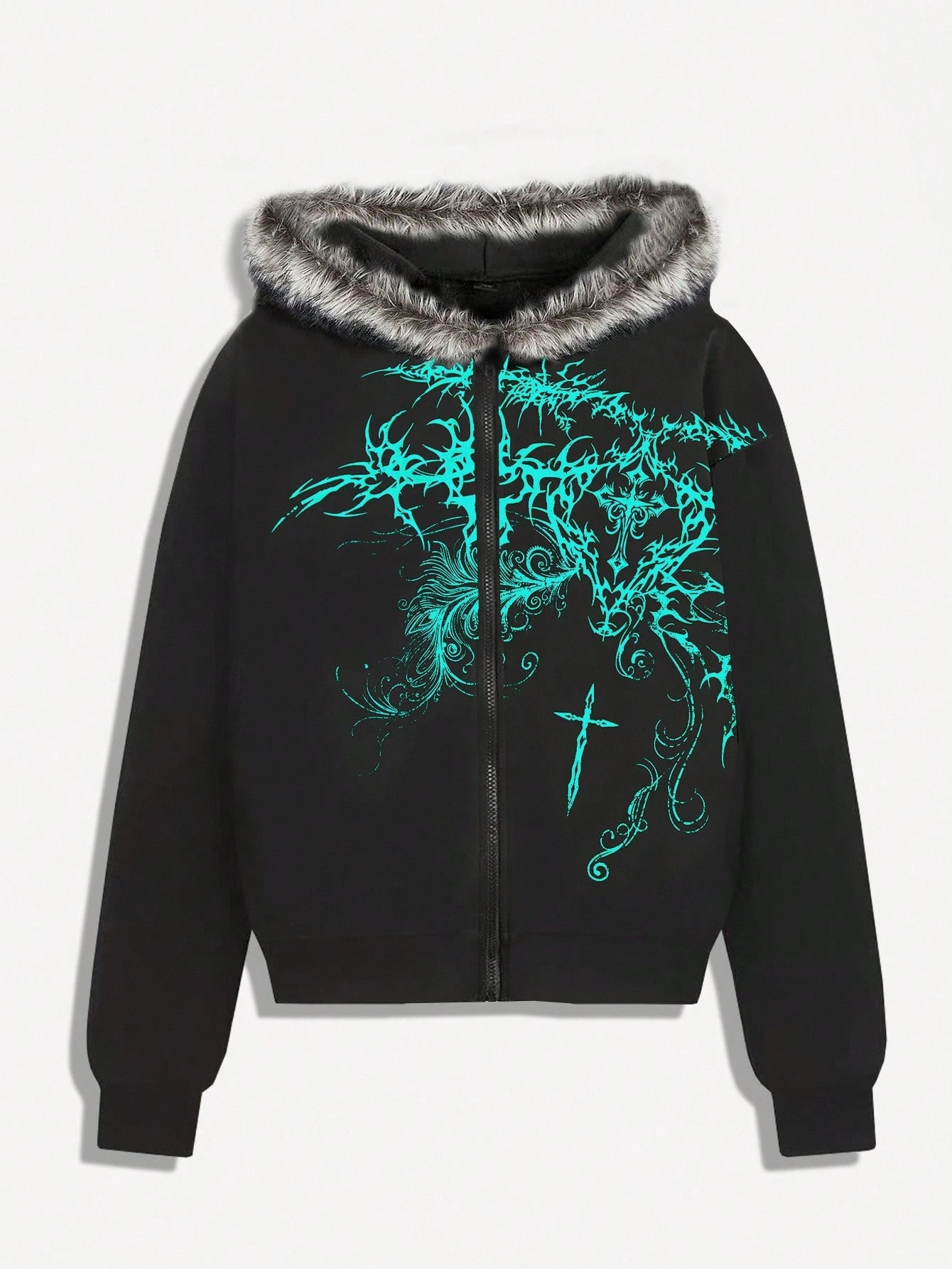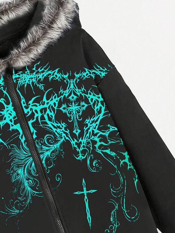 Goth Felpa casual con cappuccio in pelliccia sintetica, con stampa a croce e chiusura lampo, stile patchwork, per uomo, autunno/inverno