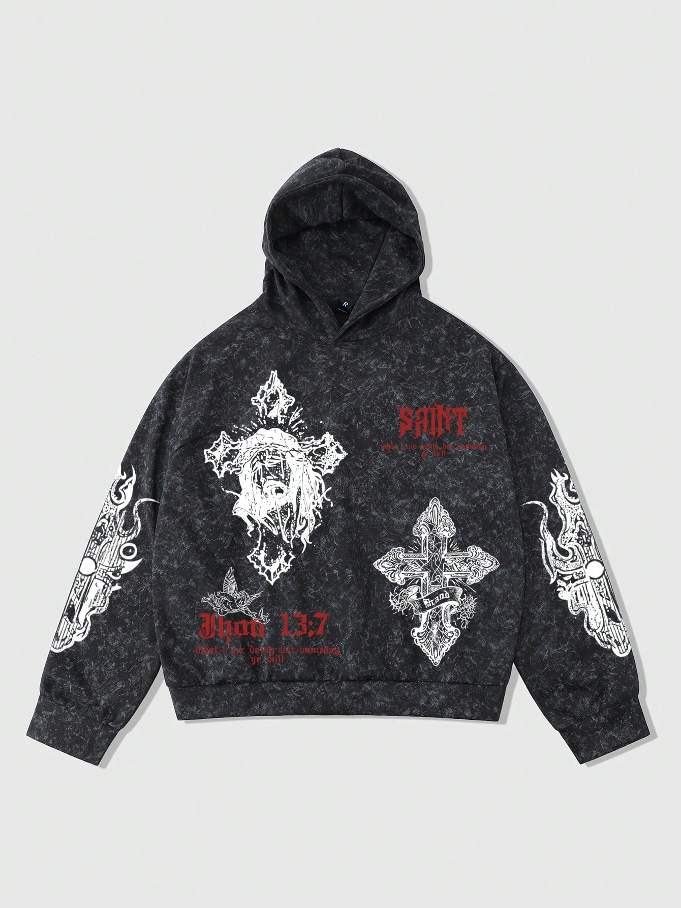 Goth Felpa con cappuccio da uomo per primavera, autunno e inverno, felpa personalizzata con grafica religiosa e stampa effetto vissuto grigio/nero, design dettagliato adatto agli uomini, versatile per occasioni casual e di stile