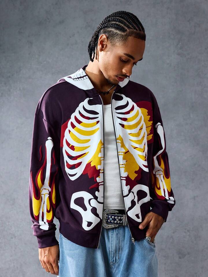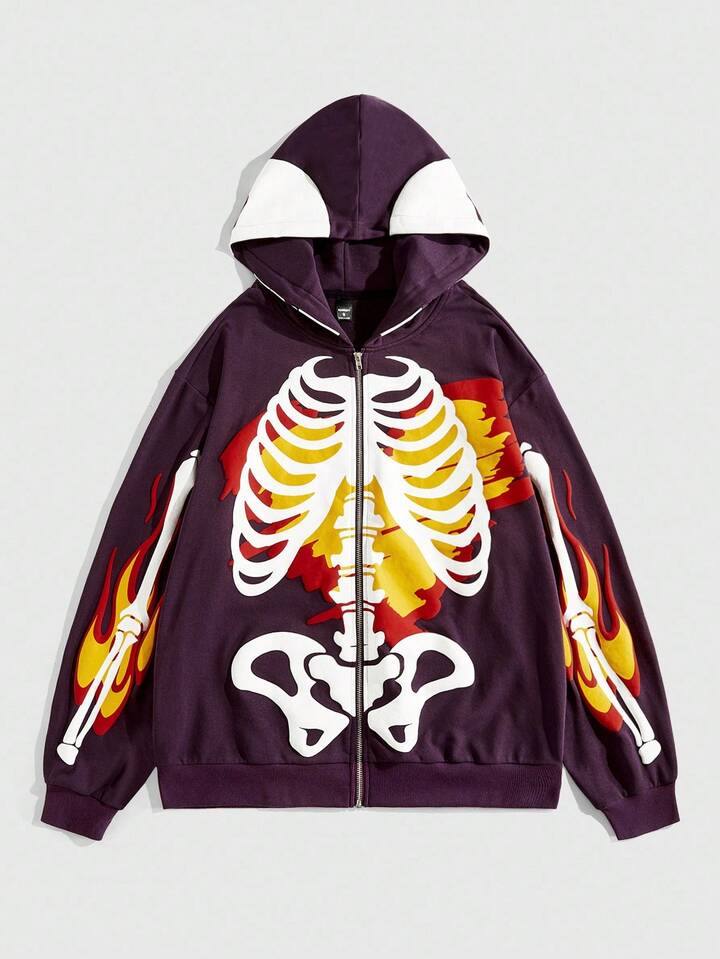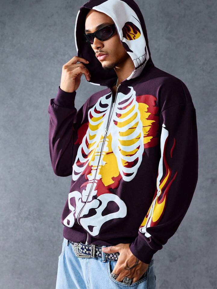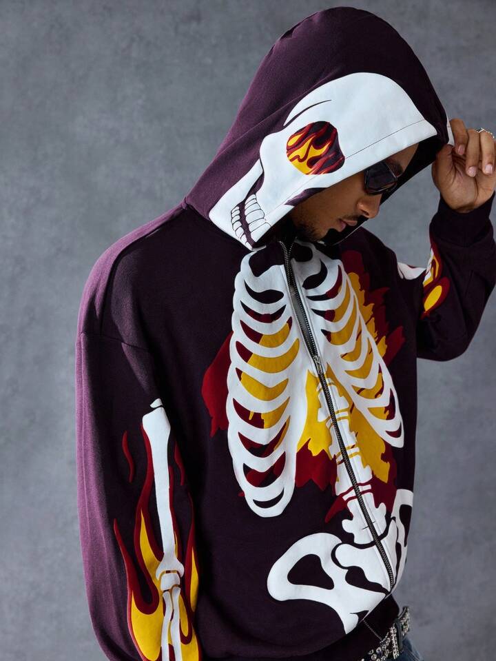 Goth Felpa con cappuccio con chiusura lampo e stampa scheletro da uomo, casual e adatta per Ognissanti