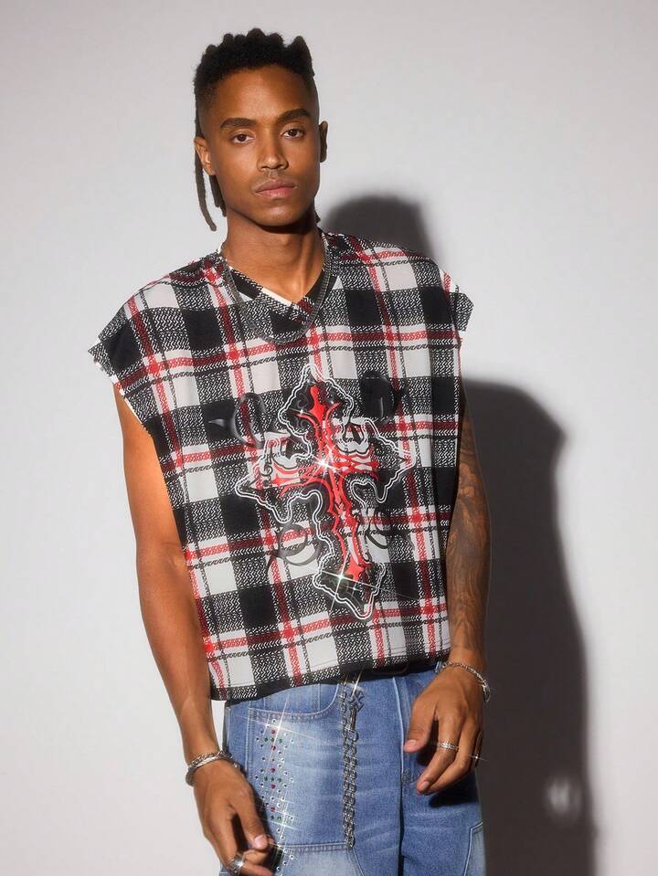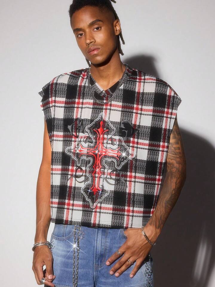 Goth Canotta casual estiva da uomo, stile versatile e ampio, con decorazioni a croce in strass, stile emo, anni 2000