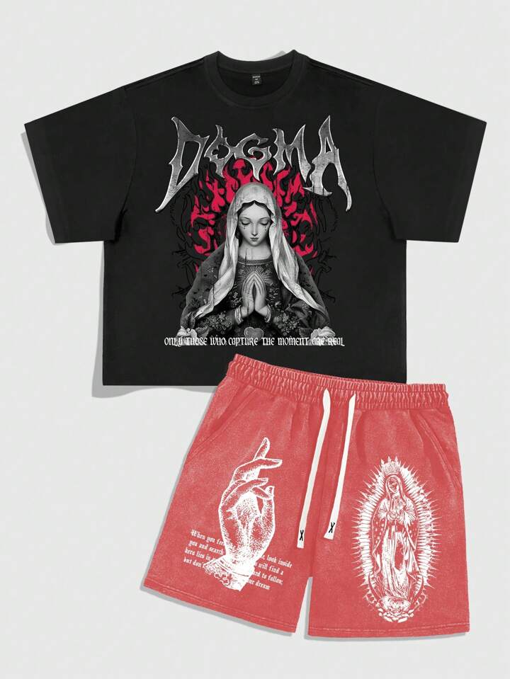 Goth Set di maglietta larga e pantaloncini con stampa della Vergine Maria per uomo