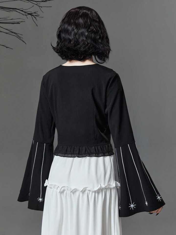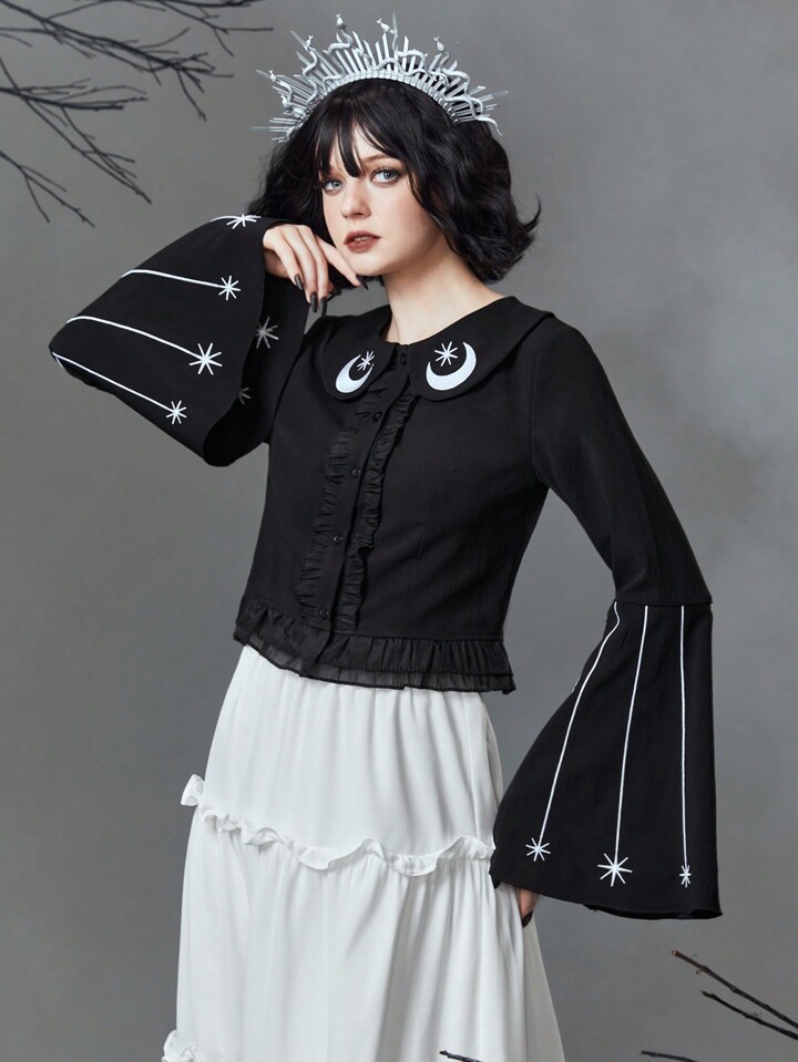 Goth Camicetta Con Maniche Svasate E Finiture A Volant Ricamate Con Luna E Stelle