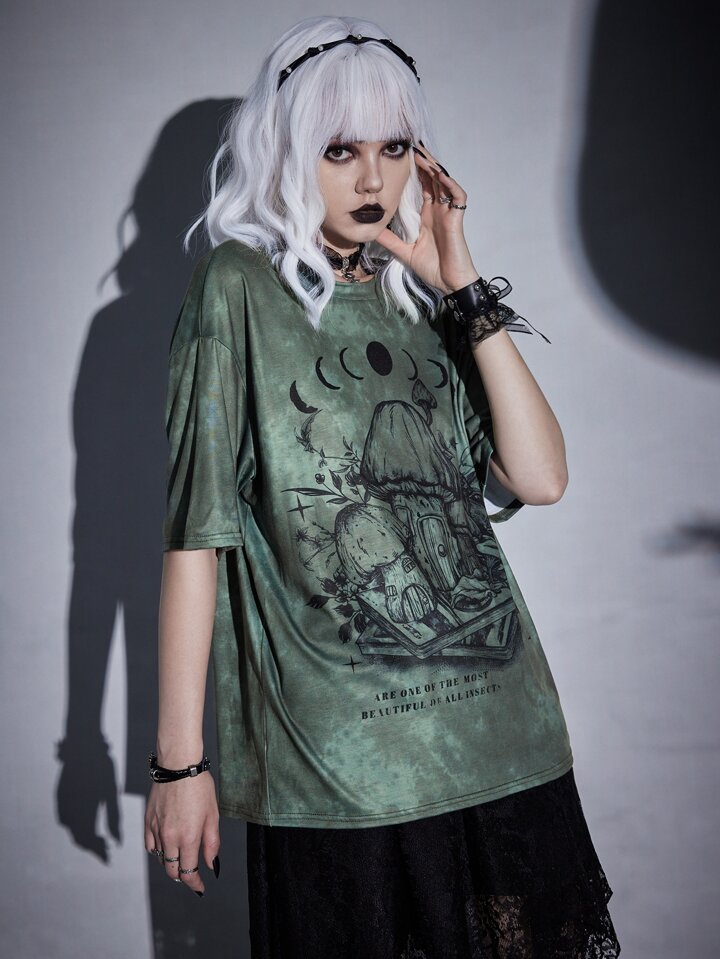 Goth Maglietta con grafica funghi tie dye