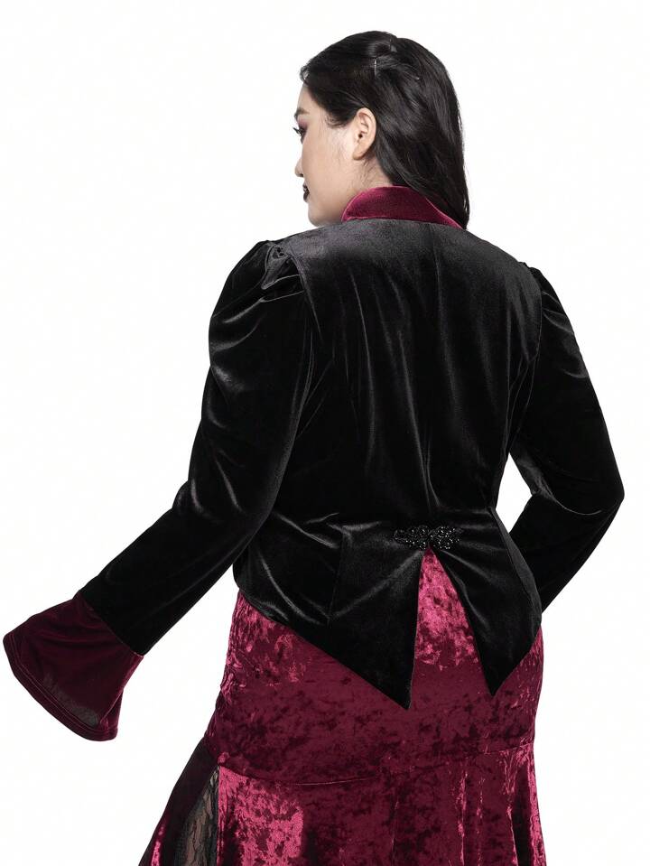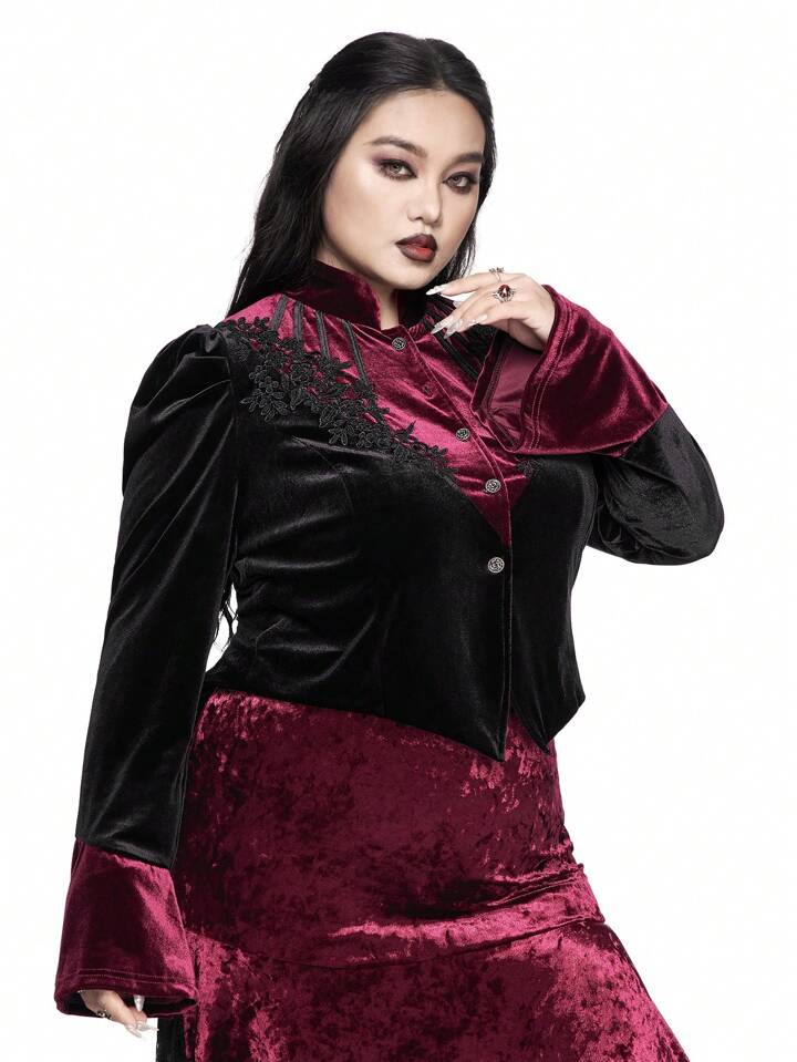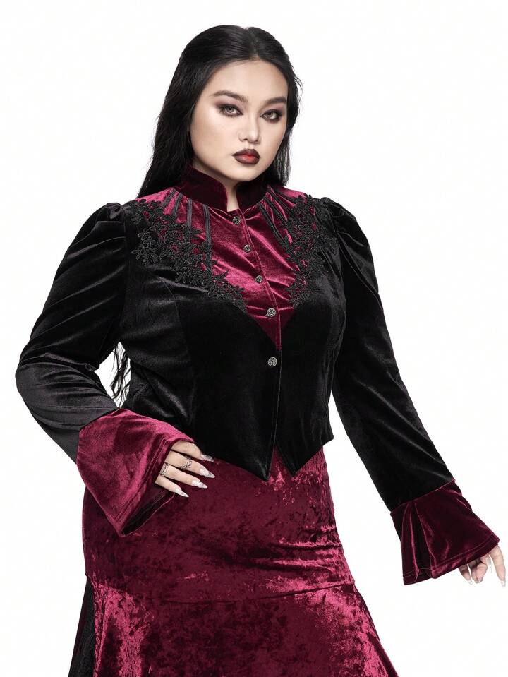Goth Giacca cardigan invernale con maniche a sbuffo, in velluto termico, con inserti in pizzo e decoro floreale, taglia oversize, per l'inverno