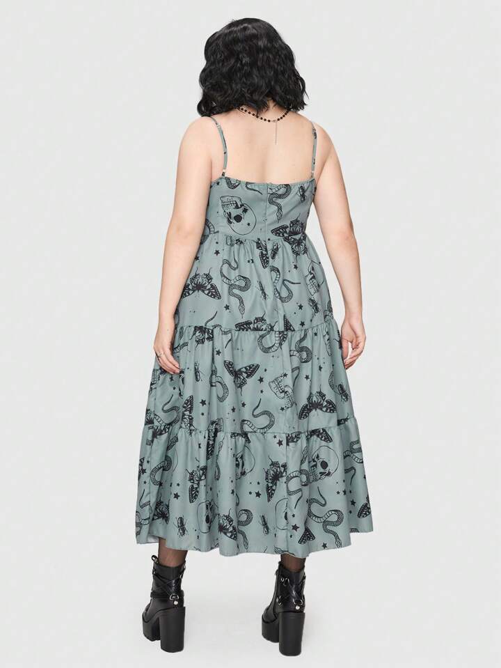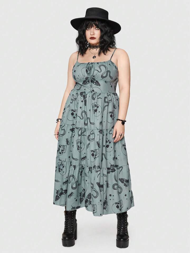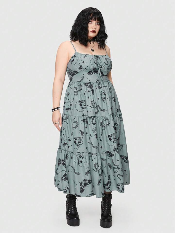 Goth Taglie Forti Abito con bretelle sottile con stampa farfalla & cranio con coulisse frontale con volant
