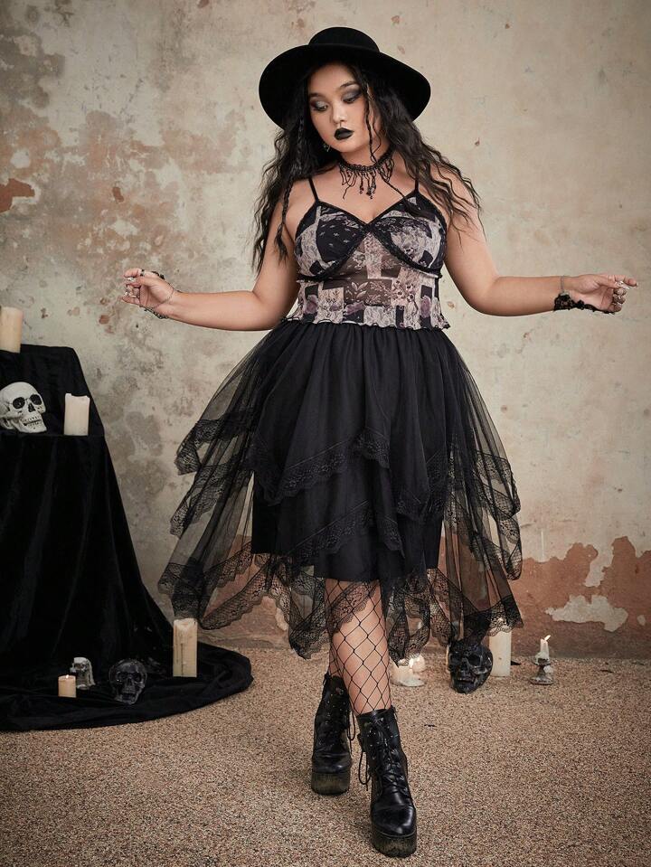 Goth Taglie Forti Gonne pizzo a contrasto sovrapposizione maglia