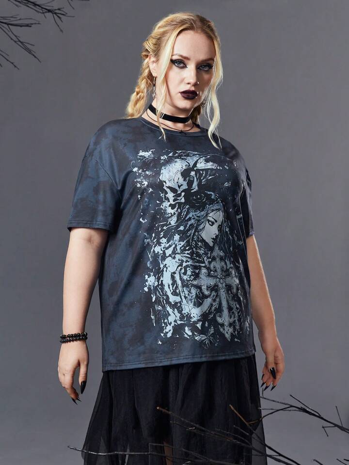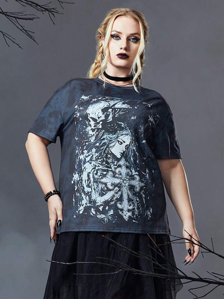 Goth Taglie Forti Maglietta con spalla cadenti con stampa figura