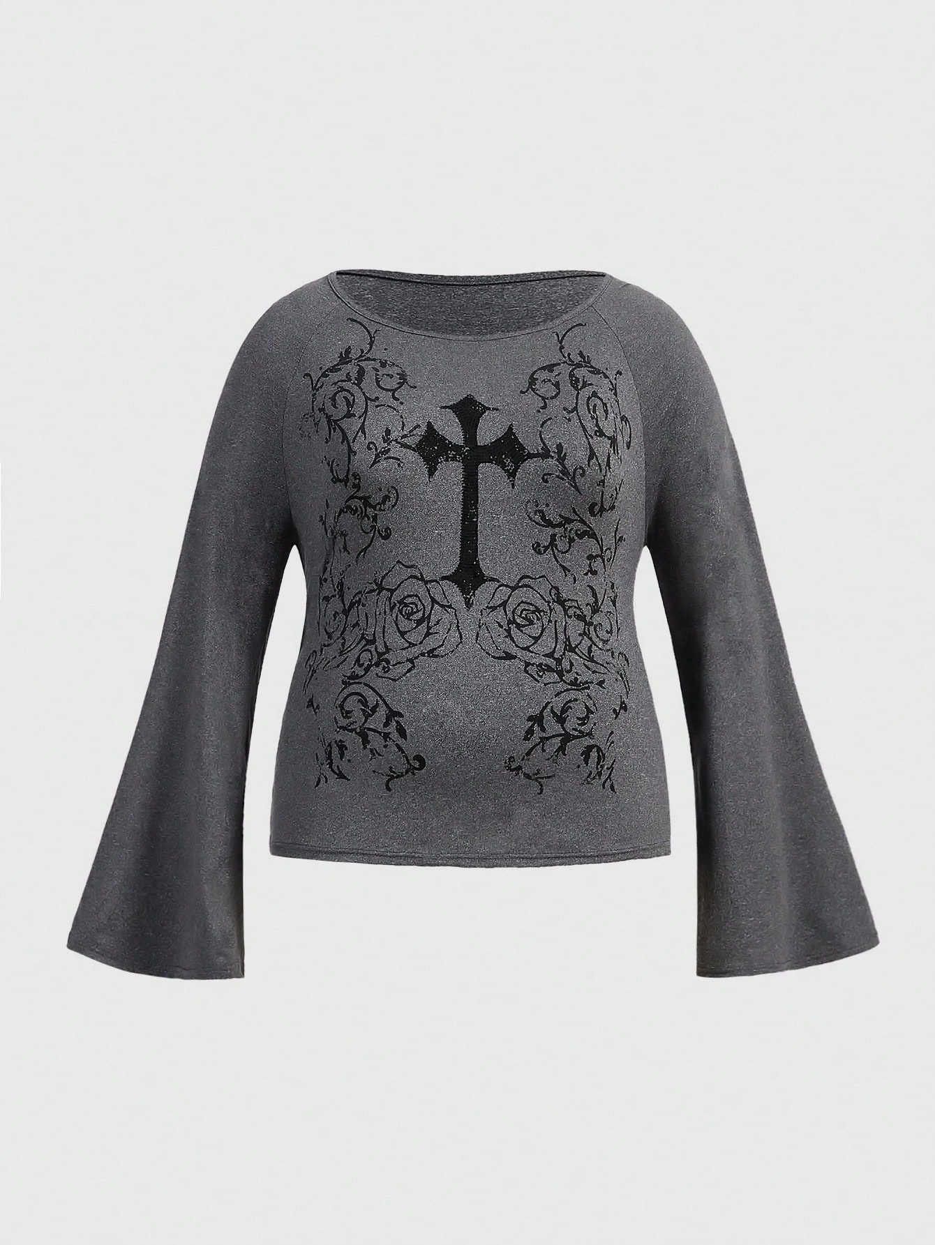 Goth Taglie Forti Maglietta floreale & incrociato stampa maniche svasata