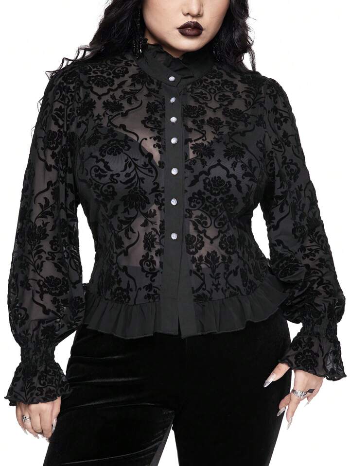 Goth Camicia oversize con scollo aperto, con bordo in pizzo floreale e maniche a sbuffo, stile regale ed elegante