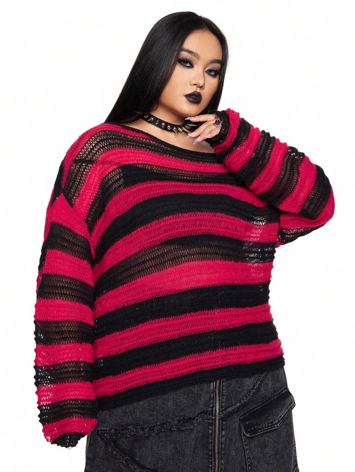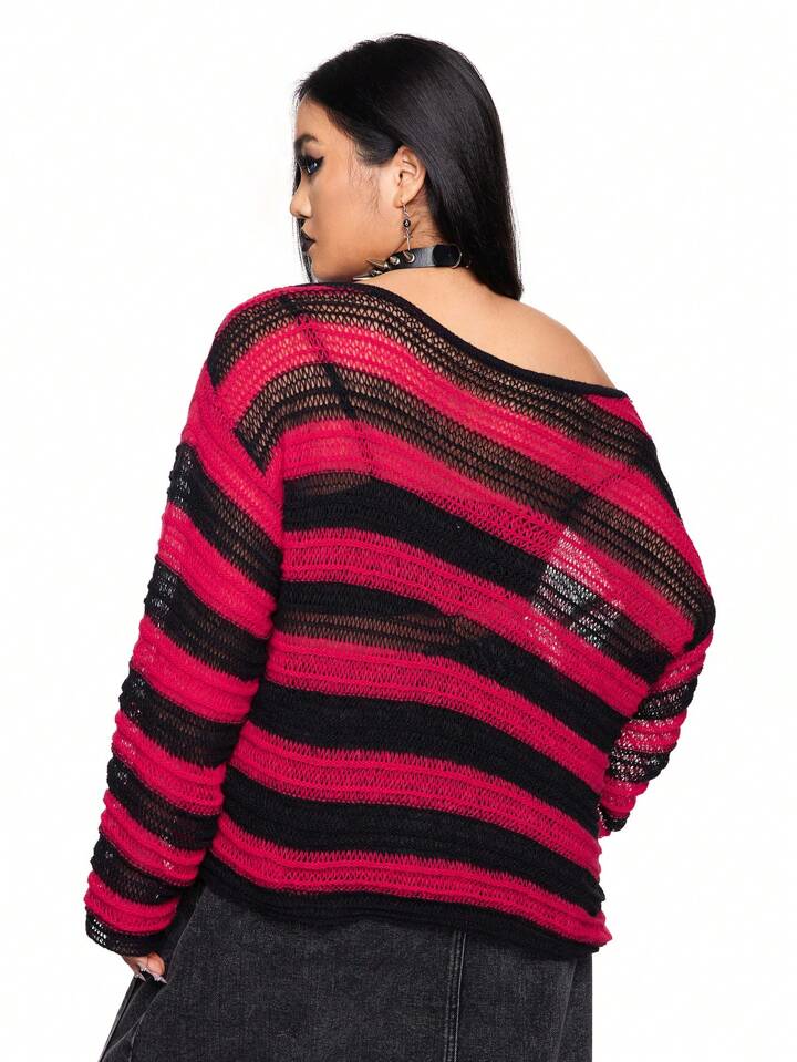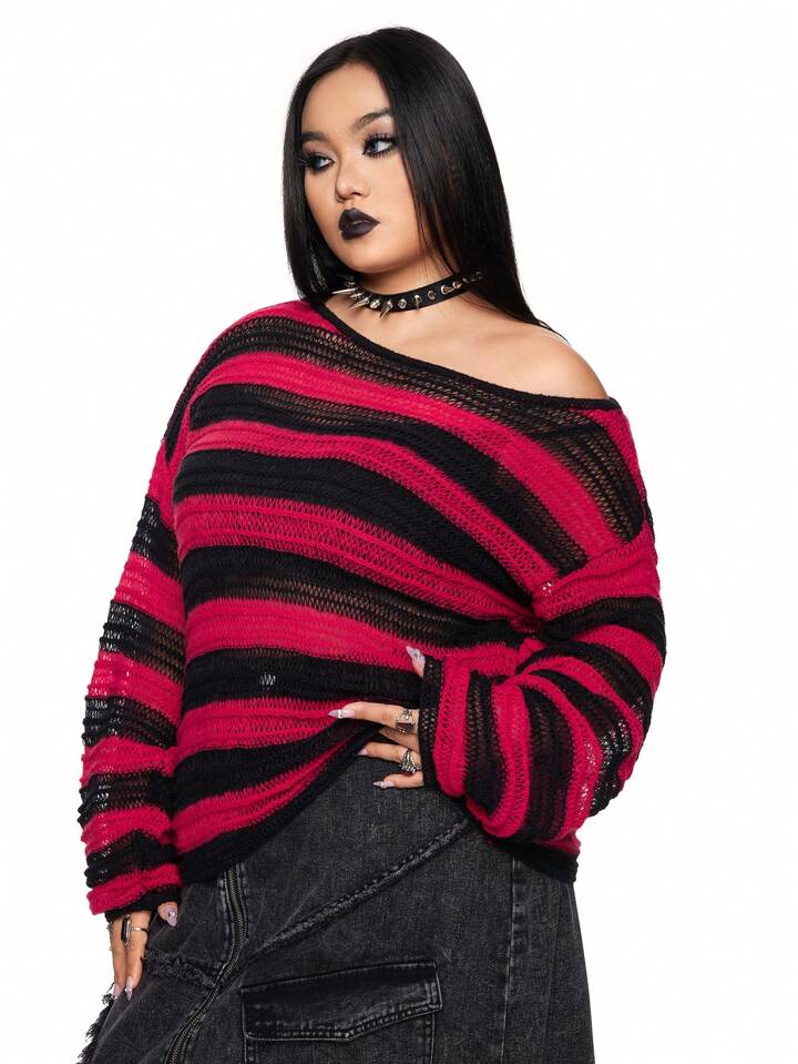 Goth Maglione oversize stile punk da donna a righe rosse e nere con collo asimmetrico, maglia larga adatta per Natale