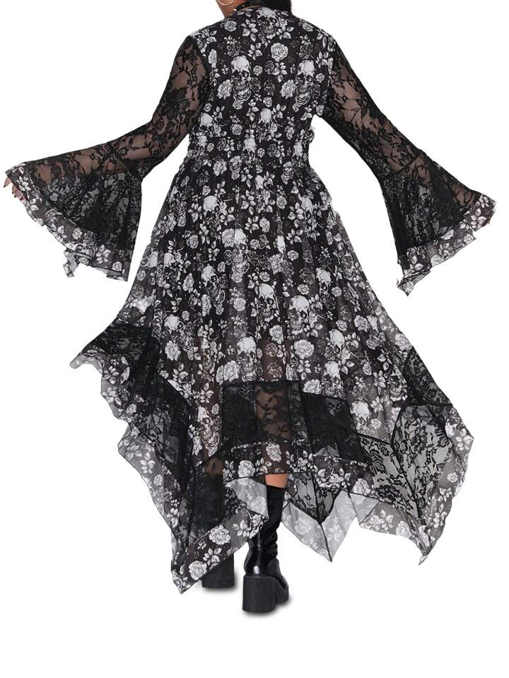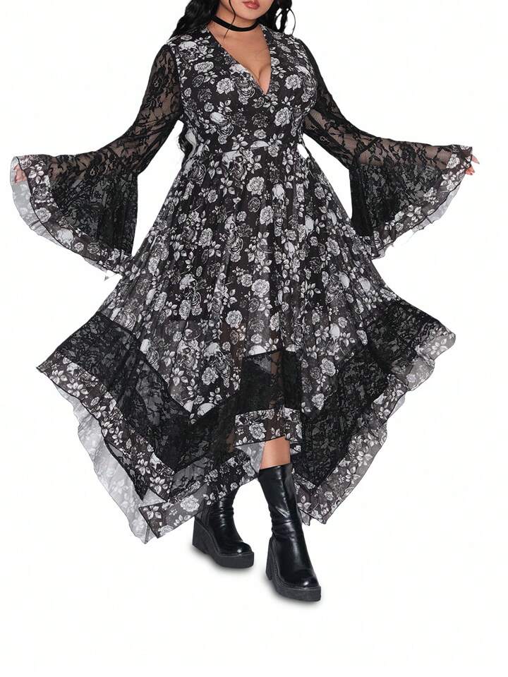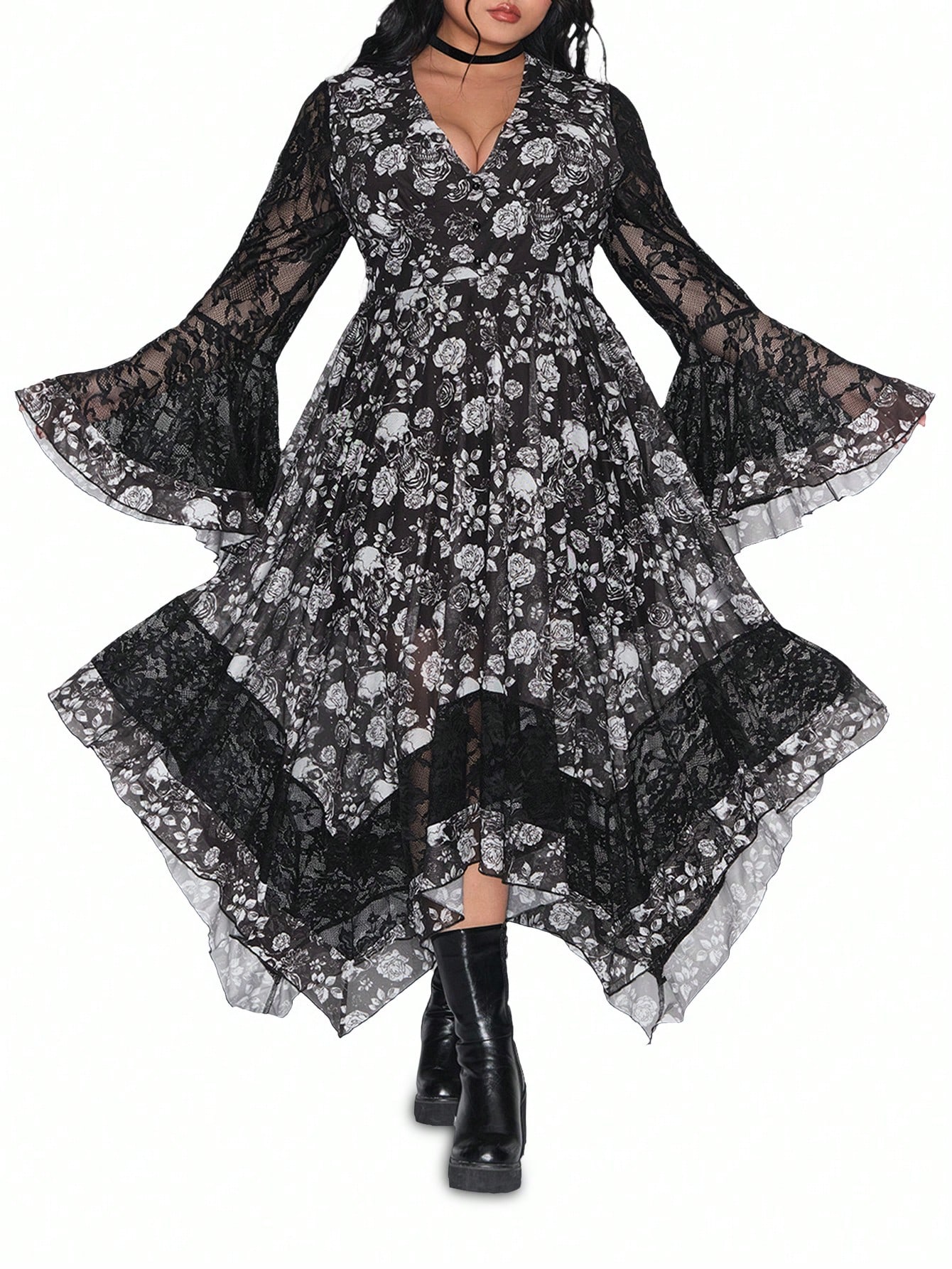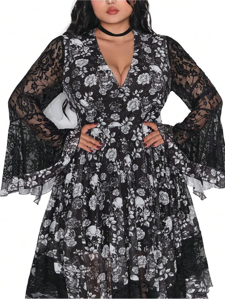 Goth Vestito da donna taglie forti vintage con stampa di teschio e rosa, pizzo e patchwork, maniche a campana