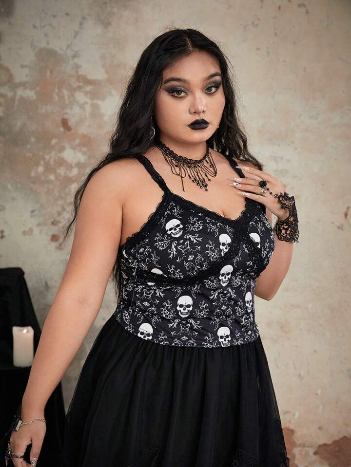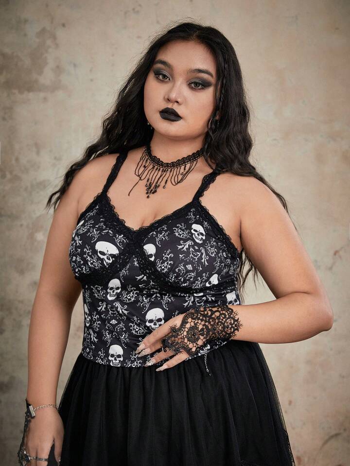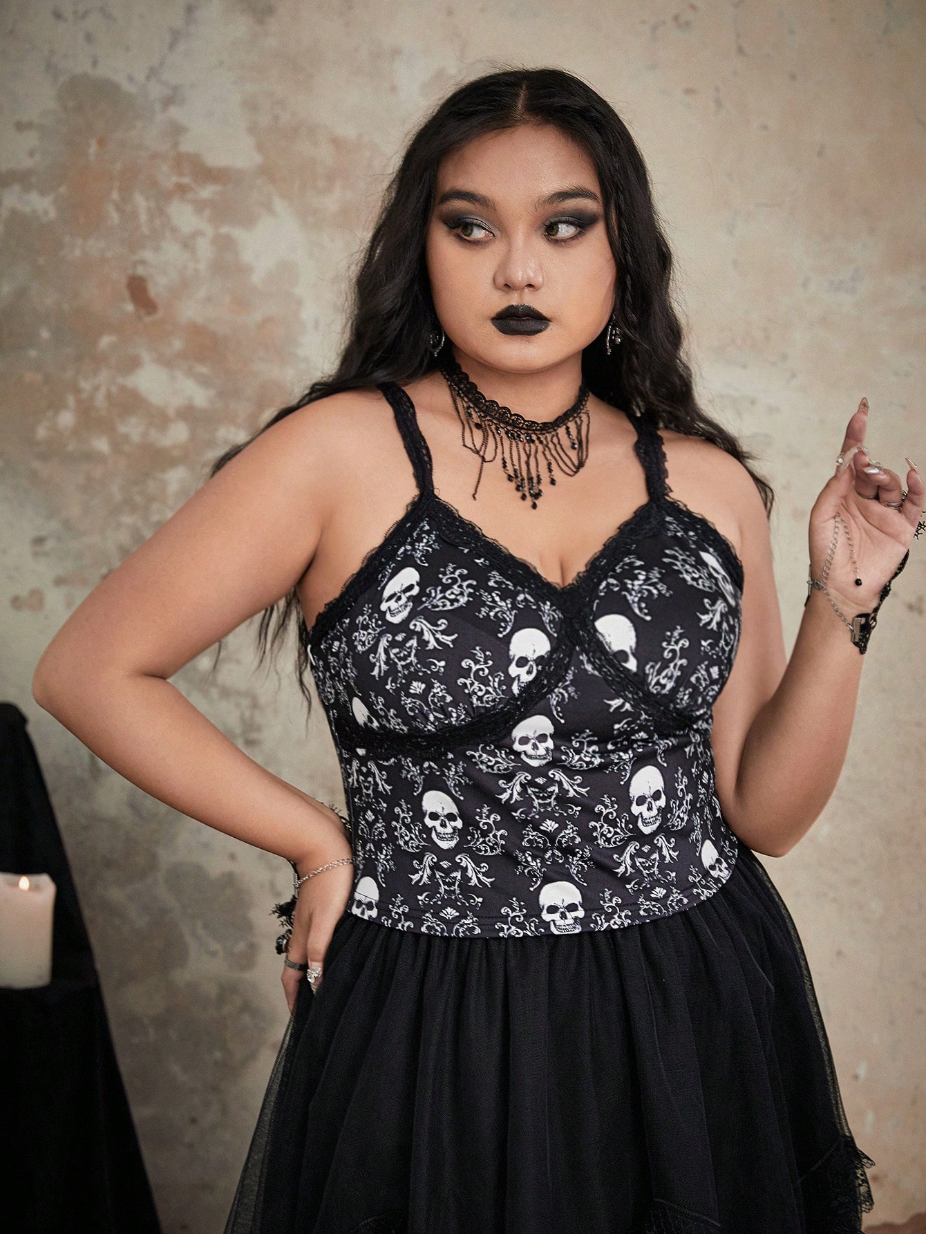 Goth Taglie Forti Top bretelle sottile con stampa teschi pizzo a contrasto