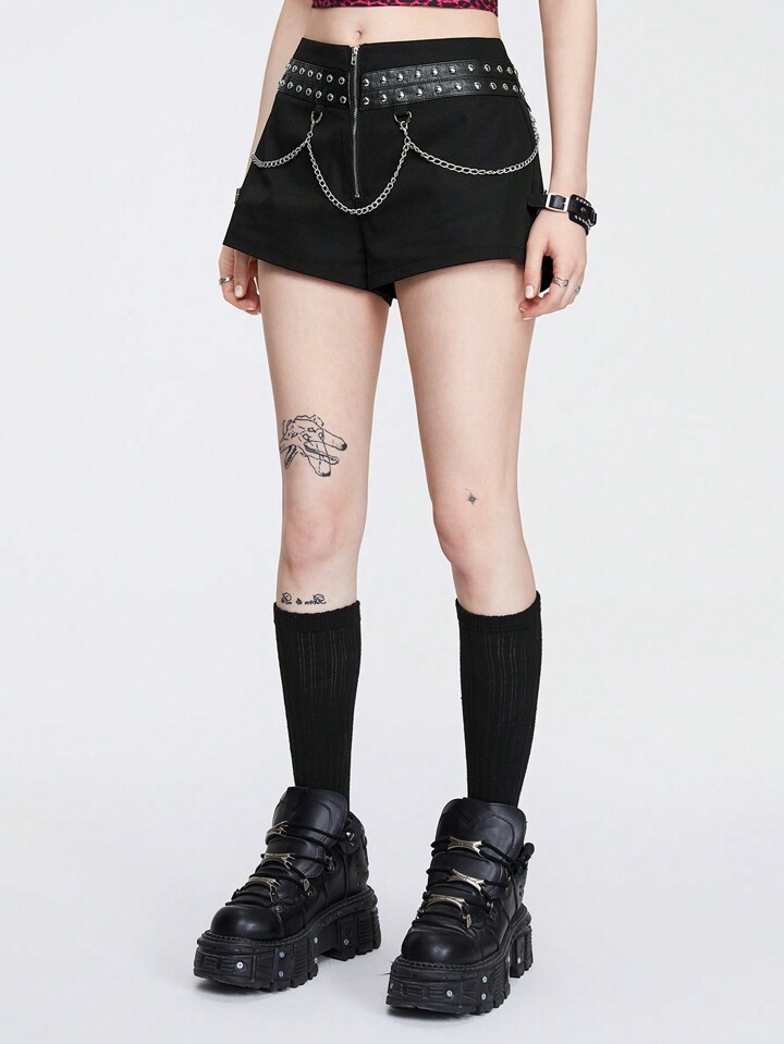 Goth Pantaloni corti da donna con basso girovita in stile punk con decorazione in metallo con borchie a catena